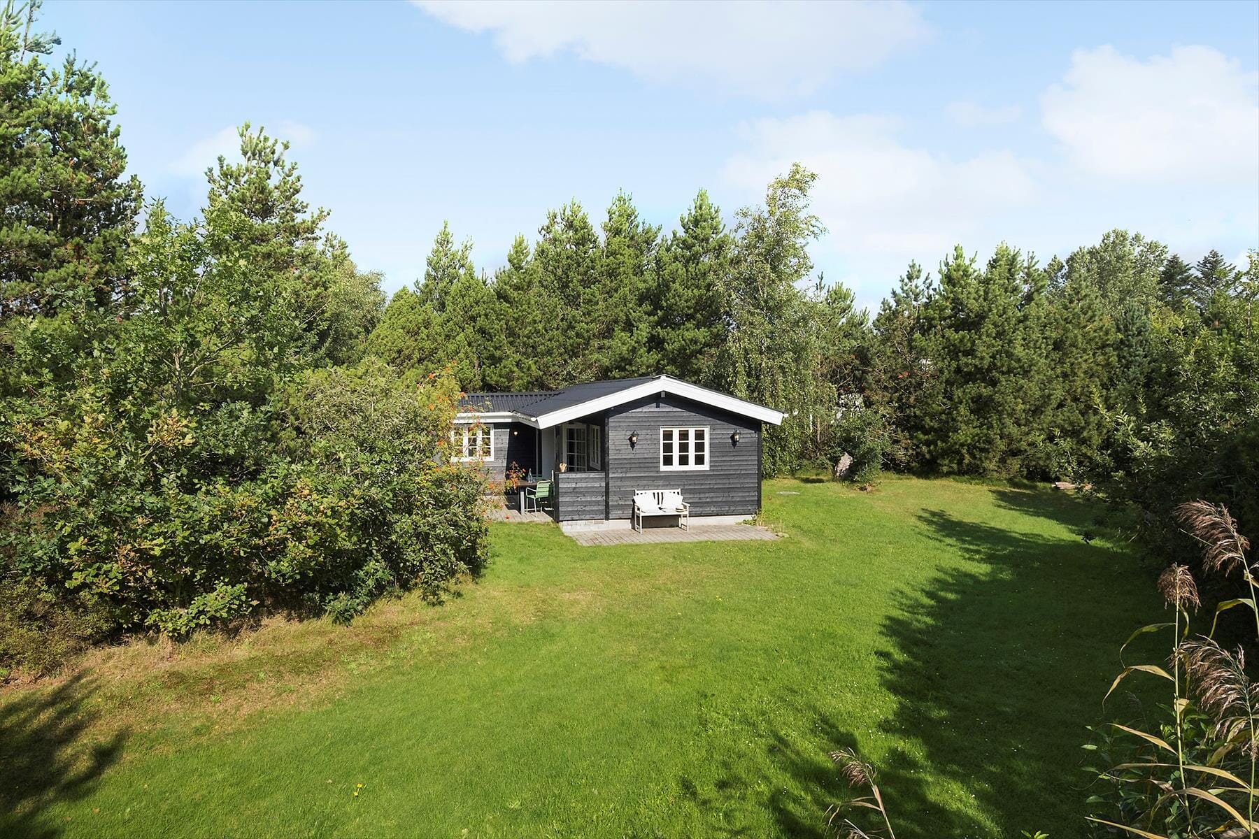 Når du træder ud på den store træterrasse, bliver du mødt af en dejlig fredfyldt atmosfære. Sommerhuset ligger på en ugeneret grund omgivet af grønne træer, hvilket giver en følelse af privatliv og ro. Her kan du starte dagen med morgenkaffe i solen eller nyde en afslappet grillaften i familiens skød, mens du lytter til fuglenes kvidren. Den store græsplæne indbyder til leg og boldspil, og de små kan frit udforske området omkring huset. Med stranden kun 5 minutters gang væk, er det let at tage en forfriskende dukkert i Kattegats klare vand eller bare tage på en rolig gåtur langs kysten og mærke sandet mellem tæerne.