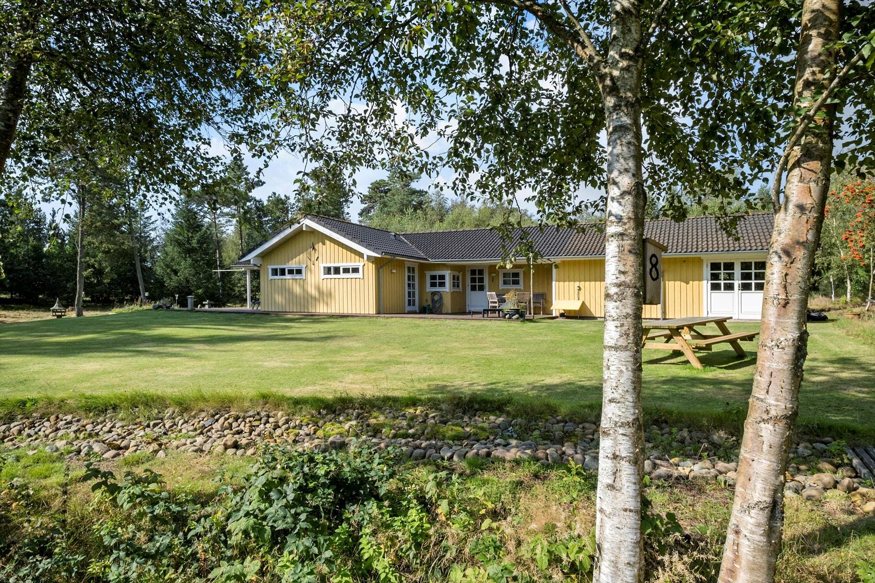 Den store naturgrund omkring sommerhuset er et paradis for naturelskere. Her kan du nyde det rige fugleliv og måske få øje på en hare, der hopper forbi. Den ugenerede beliggenhed sikrer, at du kan slappe af i fred og ro, uden at blive forstyrret af naboer. På den rummelige terrasse kan du nyde solens stråler hele dagen eller finde skygge under de høje træer. Der er masser af plads til både leg og afslapning, og børnene kan løbe rundt og lege på græsplænen, mens du slapper af med en god bog i en af de komfortable havemøbler. Når aftenen falder på, kan I samle familien til en hyggelig grillmiddag på terrassen og nyde den fredfyldte stemning.