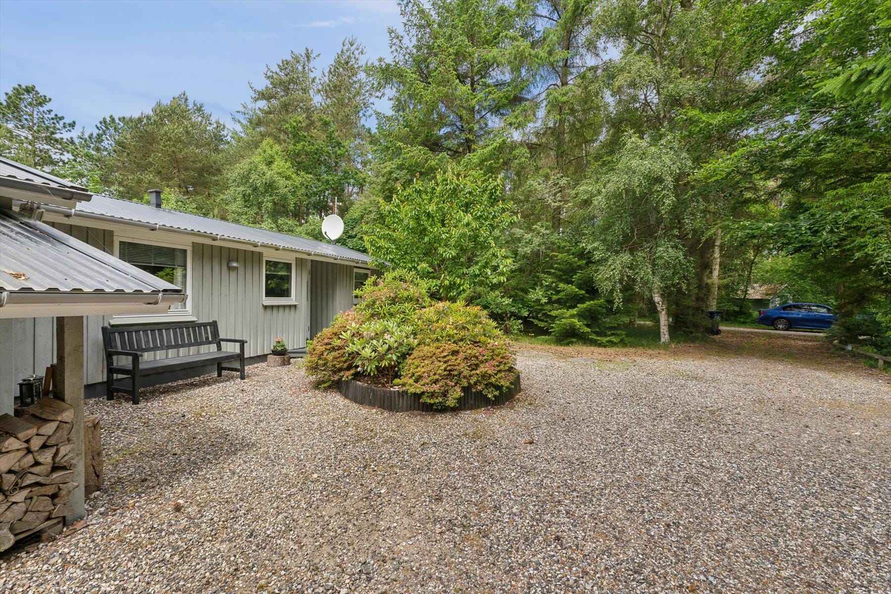Udenfor venter en stor terrasse, hvor du kan nyde både sol og skygge alt efter tid på dagen. Terrassen er perfekt til både hyggelige måltider, afslapning i solen og måske en god middag, hvor du griller på den medfølgende grill. Den store naturgrund giver både plads til at udforske området og til leg for både børn og voksne, og den frodige beplantning omkring huset sikrer, at du er omgivet af naturens ro. Efter en dejlig dag ude kan du sidde på terrassen og nyde aftensolen, mens dagen langsomt går på hæld.