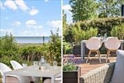 Et stort og herligt terrassemiljø breder sig syd, øst og vest for sommerhuset. Lige ved stuen ligger et overdækket og afskærmet areal, og ellers er resten af terrassen åben, så det er nemt at finde den helt rette opholdsplads alt efter vejr og humør. Vil I lege og være aktive, er der mulighed for at gynge, bygge sandslotte i sandkassen og spille fodbold på græsplænen, og der er også en mooncar til de yngste.