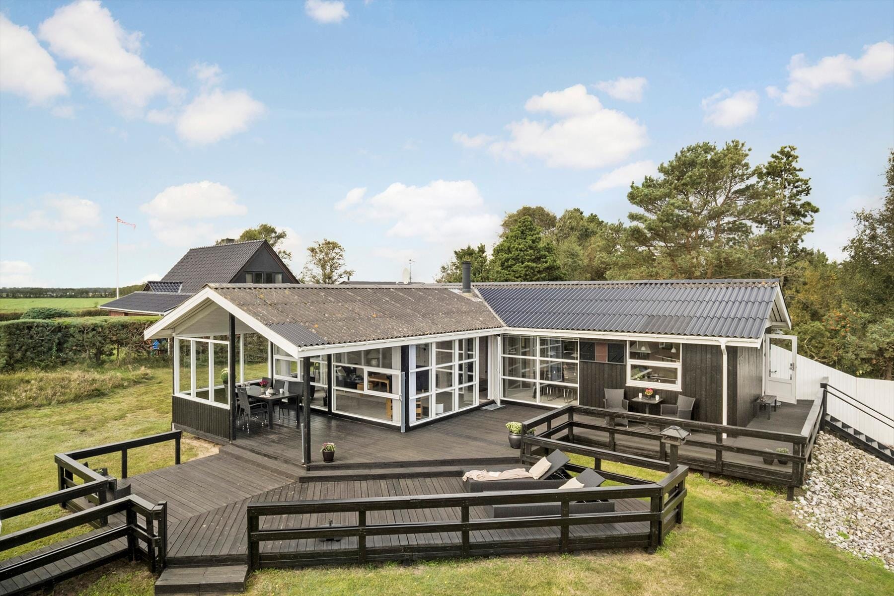 Et stort og herligt terrassemiljø breder sig syd, øst og vest for sommerhuset. Lige ved stuen ligger et overdækket og afskærmet areal, og ellers er resten af terrassen åben, så det er nemt at finde den helt rette opholdsplads alt efter vejr og humør. Vil I lege og være aktive, er der mulighed for at gynge, bygge sandslotte i sandkassen og spille fodbold på græsplænen, og der er også en mooncar til de yngste.