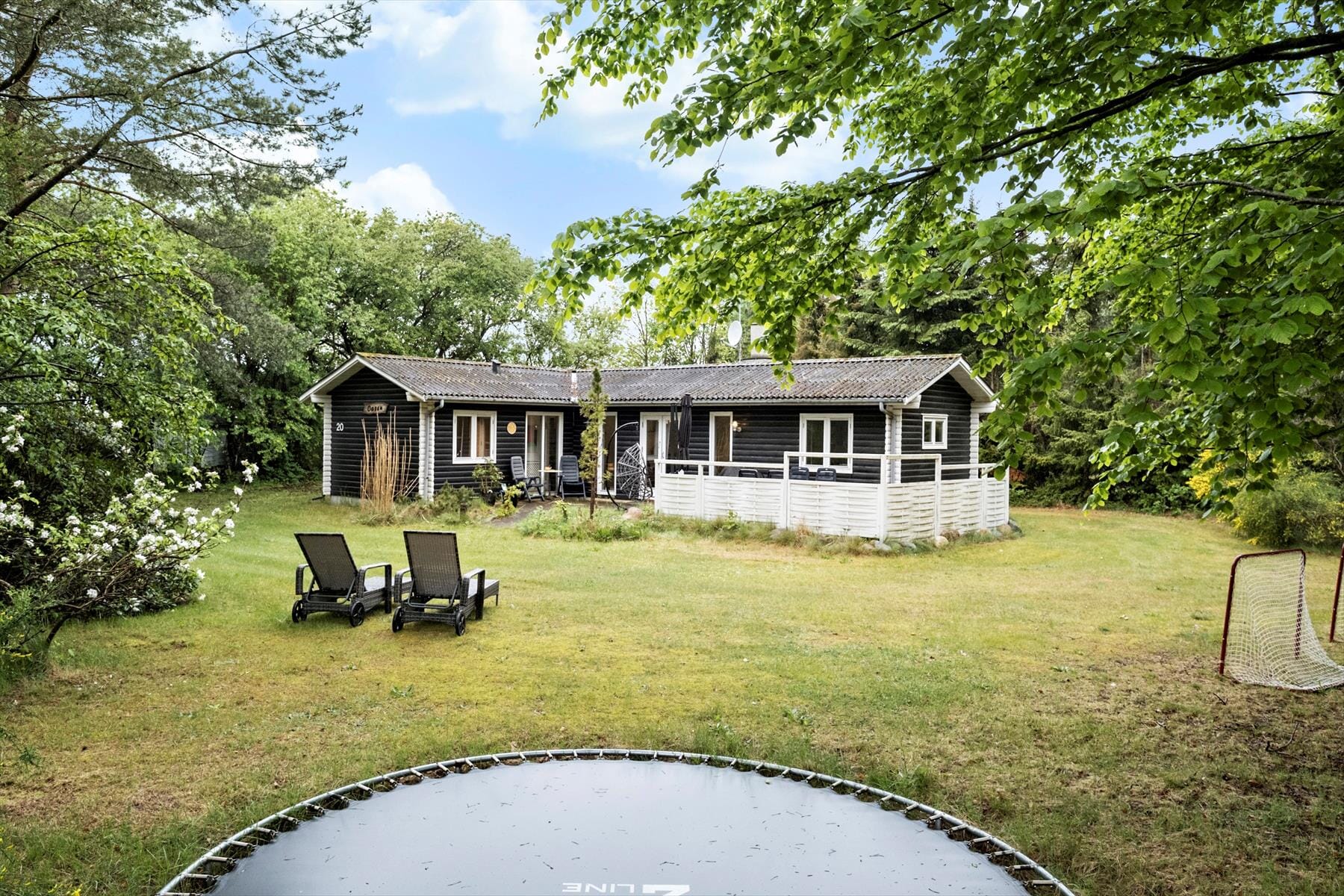 På som­mer­hu­sets sydøstlige side kan I slå jer ned på terrassen, der er udstyret med havemøbler, grill og en parasol. Der er også lig­ge­sto­le, hvis I får brug for en mid­dag­slur efter solskin­s­froko­sten, og hvis børnene derimod trænger til at brænde energi af, er der trampolin og plads til at spille bold på græsplænen.
