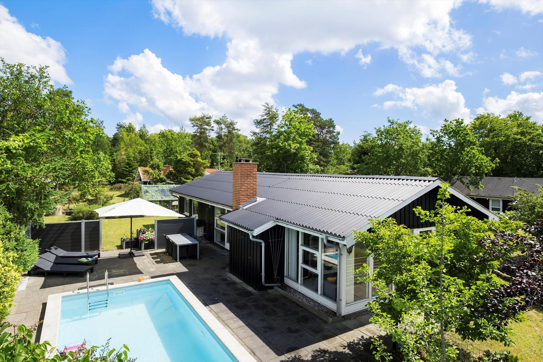 Huset ligger på en flot og enormt velholdt havegrund med nydelige bede, buske og blomster. Der er desuden en lille, hyggelig havedam og en gammel rygeovn. På husets store terrasse er der den dejligste, solopvarmede pool, som indbyder til afkølende dukkerter på varme dage og mange timers badesjov på bedste Sydeuropæiske manér. Bemærk dog, at poolen er100 % solopvarmet og temperaturen kan ikke garanteres!