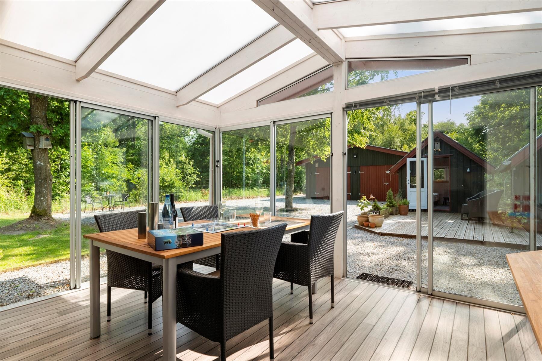 Udenfor breder en stor naturgrund sig omkring huset, og du mærker hurtigt den særlige ro, som kun findes, når man er omgivet af grønne omgivelser og fuglekvidder. Hele grunden er indhegnet, så både børn og hunde kan færdes frit og trygt, og det gør det nemt at slappe af og bare være til stede i nuet. Find dig til rette i en havestol, nyd eftermiddagskaffen i solen, eller dæk op til grillmiddag under åben himmel. Her er rig mulighed for både at være aktiv og for bare at nyde stilheden og de fredelige omgivelser. Udestuen fungerer som et dejligt overgangsrum mellem inde og ude – og på kølige aftener er det et oplagt sted at fortsætte feriehyggen med tæpper og levende lys.