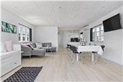 Lyst og moderne feriehus. Det store kombinerede køkken/alrum og stue i et bliver helt sikkert samlingspunktet i ferien. Køkkenet er udstyret med opvaskemaskine, mikroovn og køle-fryseskab. Omkring spisebordet er rigelig plads til feriegæsterne. Stuen har en dejlig sofagruppe og fladskærms tv. Der er 2 værelser, et værelse med dobbeltseng og et med køjer, hvor man sover rigtig godt. Derudover er der to sovepladser i stuen. Huset råder over et stort badeværelse med brus og vaskesøjle. Her byder vi på et hus, der giver dig som gæst alle muligheder for at slappe af og nyde ferien.