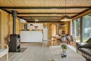 Husets køkkenalrum er i åben forbindelse med stuen. Her kan man rigtig nyde naturen og haven udenfor, gennem de store panoramavinduer. Køkkenet er fint udstyret, så man kan kreér lækkert mad til hele familien. Hvis det bliver køligt kan man tænde op i pejsen og nyde ilden knitre og feriestemningen. Huset har plads til familien eller vennerne der gerne vil på tur sammen. Her er tre soverum; alle med dobbeltsenge