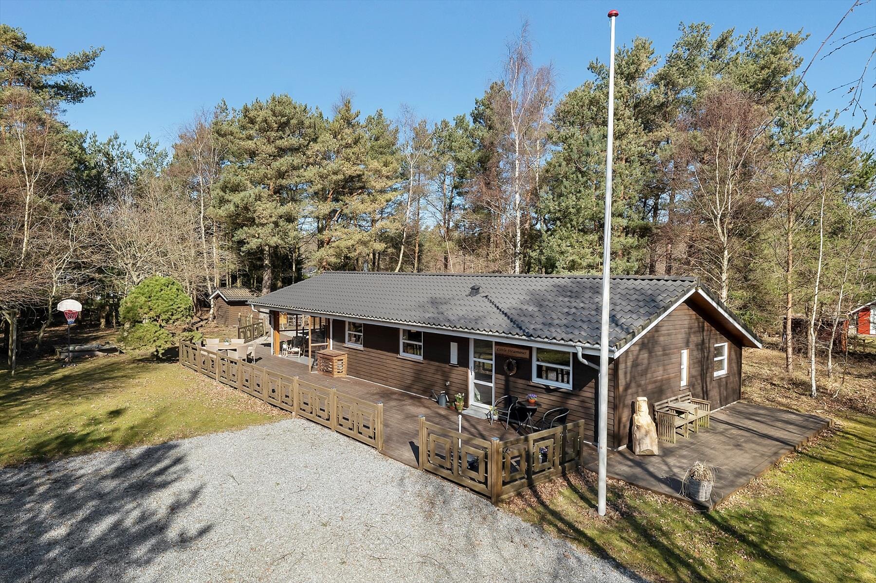 Den store grund omkring sommerhuset er en oplevelse i sig selv. Her kan du virkelig gå på opdagelse og nyde følelsen af at være midt i naturen – næsten som om du bor i din egen lille skov. Fuglene kvidrer i trætoppene, egern springer fra træ til træ, og vinden hvisker gennem grenene, mens du slapper af i solen eller finder en skyggefuld plet med en god bog. Der er masser af plads til leg, boldspil og afslapning, og børnene vil elske at udforske de grønne omgivelser. Når dagen går på hæld, kan du tænde op i grillen og lade duften af sommer brede sig, mens aftenen falder stille på. Her er der tid til at nyde de små øjeblikke – et glas vin i solnedgangen, latter fra terrassen og den helt særlige feriestemning, som kun et sommerhus kan give.