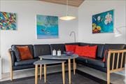 Dette flotte feriehus fra 2018 ligger tilbagetrukket i et skønt naturområdet. Stuen og det åbne køkken, råder over store vinduespartier som lukker lys og naturen ind og giver samtidigt en dejlig atmosfære i huset. Sovepladserne er fordelt på tre gode soveværelser. Det sidste soveværelse befinder sig i forlængelse af huset, dog skal man gå igennem terrassedøren over terrassen for at komme til dette soveværelser. Huset har også fine badeværelser. Her er plads til en dejlig ferie med hele familien.