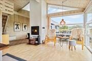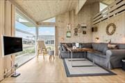 Sommerhusets indre er lyst og imødekommende med en hyggelig atmosfære, der straks får dig til at føle dig hjemme. Den åbne opholdsafdeling danner rammen om ferielivet med stue og køkken i ét – perfekt til nærvær og fælles aktiviteter. Brændeovnen står klar til at sprede varme og stemning på kølige aftener, mens store vinduespartier lader lyset strømme ind og trækker den smukke natur udenfor helt tæt på. Som noget særligt har huset en hems med udsigt til det omkringliggende landskab – et helt ideelt sted at slå sig ned med en god bog eller blot nyde roen. Hemsens placering gør det til en favorit blandt både store og små, og dens hyggelige rammer bidrager til husets charme.