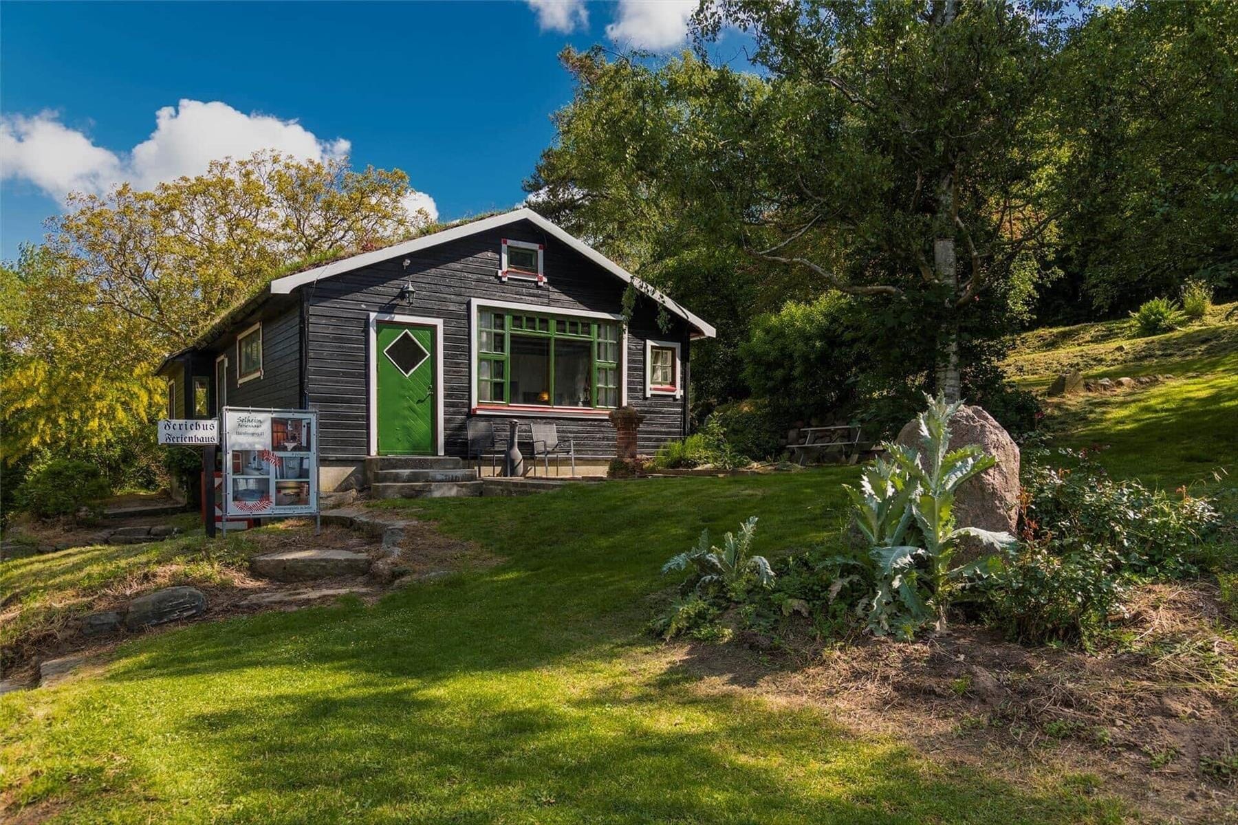 På den kuperede naturgrund omkring sommerhuset vil du hurtigt finde dit yndlingssted at nyde solen og den friske luft. Måske starter dagen med en kop kaffe på terrassen, hvorfra du kan beundre den uforstyrrede udsigt over havet og de omkringliggende grønne områder. Børnene kan lege frit på den store grund, mens du slapper af med fuglesang i baggrunden. Når dagen går på hæld, og solen maler himlen i gyldne nuancer, kan du tænde op i grillen og nyde aftensmaden under åben himmel. Her kan du virkelig koble af og komme helt tæt på naturen.