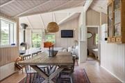 Dette moderne og rummelige sommerhus er designet til at skabe en lys og venlig atmosfære, hvor hele familien kan slappe af og nyde ferien. Hjerterummet er det store køkken-alrum med højt til loftet og imponerende vinduespartier, der bringer naturen helt tæt på. Her kan I samles om madlavningen, mens børnene leger i opholdsstuen eller ved det lange spisebord. En bred gang mellem stuen og værelserne er ikke blot en passage – den er akustikdæmpende og fungerer som et ekstra legeområde på regnfulde dage, hvilket gør huset oplagt til børnefamilier.