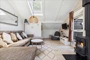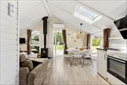 Når du træder indenfor, mødes du af en lys og hyggelig atmosfære, hvor hver detalje er skabt med komfort og afslapning for øje. Opholdsstuen er indrettet med en varm og indbydende stil, og herfra kan du træde direkte ud på terrassen og starte dagen med en kop kaffe, mens rådyrene roligt bevæger sig gennem haven. Det åbne køkken ligger i forbindelse med spisepladsen og opholdsstuen, så du kan nyde samværet, uanset om du laver mad eller slapper af i sofaen. Spisepladsen er placeret i et hyggeligt indhak med vinduer, der giver et skønt lysindfald og udsigt til haven. Når aftenen falder på, kan du trække dig tilbage til et dejligt soveværelse med dobbeltseng, mens børnene kan finde sig til rette i det hyggelige værelse med køjeseng.
