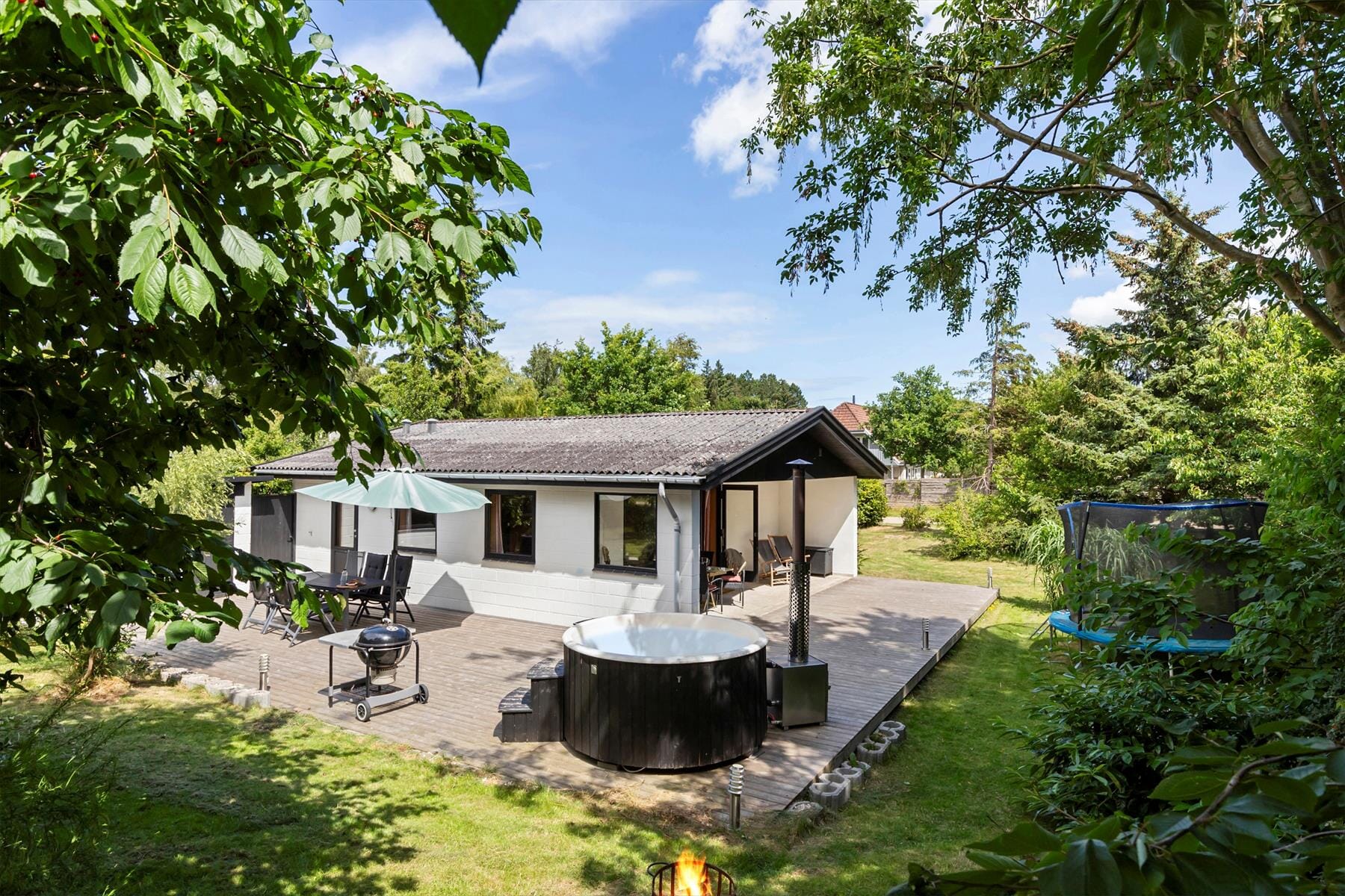 Sommerhuset er omgivet af en dejlig have, hvor både børn og voksne kan nyde naturen og slappe af. På den store terrasse, der delvist er overdækket, kan du nyde din morgenkaffe i solen eller samle familien til grillmiddag på lune sommeraftener. Haven byder også på en trampolin, hvor de yngste kan brænde energi af, og en bålplads, hvor I kan lave snobrød og riste skumfiduser over flammerne.