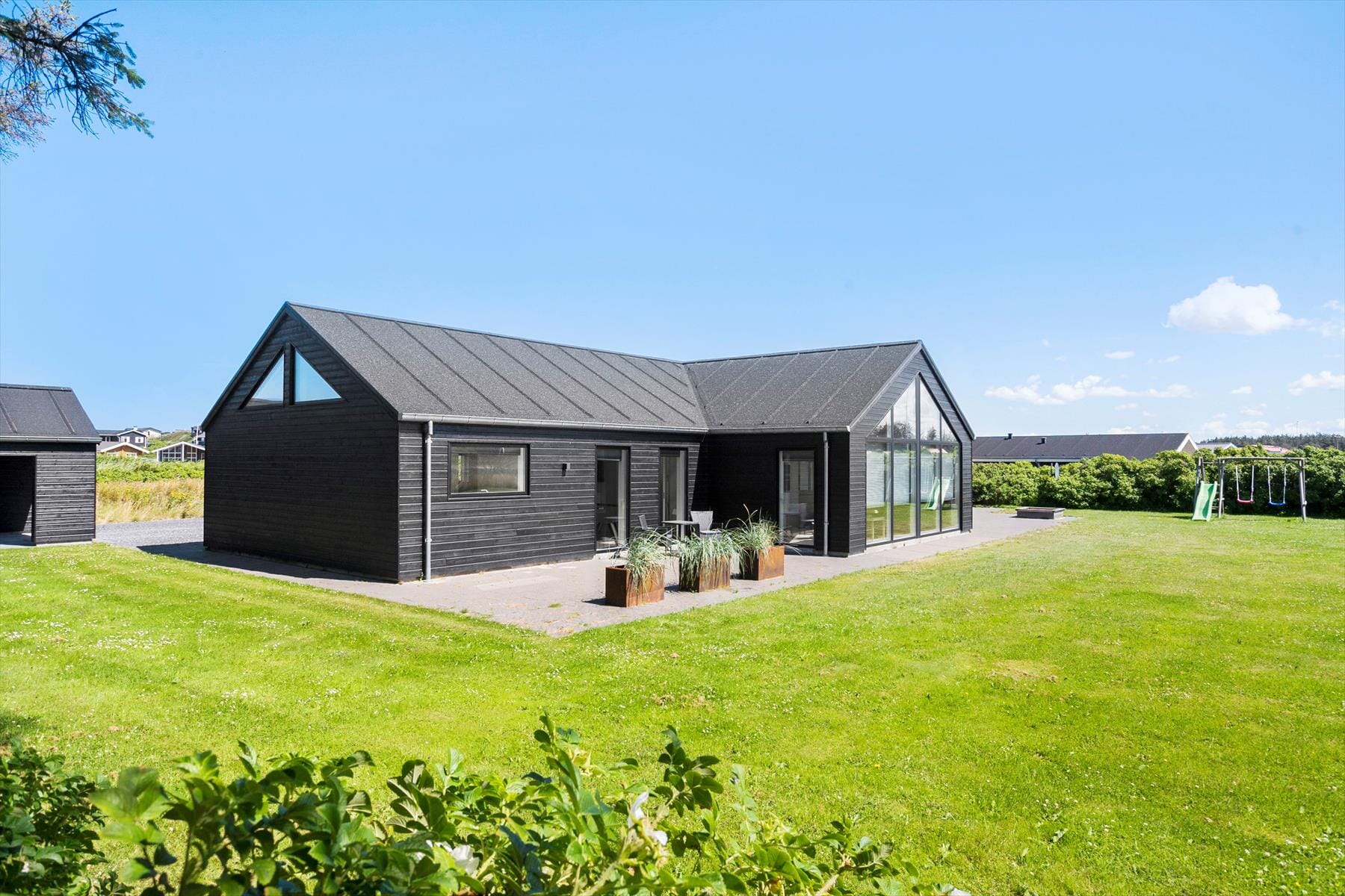 Dette kva­li­tets­som­mer­hus fra 2018 byder på særdeles god komfort og moderne fa­ci­li­te­ter. Hele huset er lyst og venligt indrettet og for­de­lin­gen af rummene med to soveværelser i hver ende, gør som­mer­hu­set særdeles velegnet til to familier, eller hvis man har større børn eller teenagere med på ferien, som gerne vil kunne trække sig lidt tilbage. Udover soveværelserne råder som­mer­hu­set over et flot og åbent køkken med gode hårde hvi­de­va­rer, et lyst op­holds­rum med spisebord, so­faar­ran­ge­ment og stort fjernsyn. Der er to badeværelser, hvoraf det ene har spabad og en sauna, hvor I kan få varmen efter en frisk gåtur ved stranden. Huset er to­pi­so­le­ret og hører til i den ener­gi­ven­li­ge klasse og har jordvarme i alle rum. Generelt et meget ind­by­den­de hus i høj kvalitet