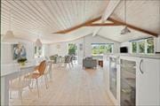 Indenfor mødes du af en lys og indbydende atmosfære, hvor det fantastiske lysindfald straks fanger opmærksomheden. Sommerhusets opholdsrum er indrettet med køkken og stue i åben forbindelse, hvilket skaber et naturligt samlingspunkt for hele familien. Her kan I tilbringe lange feriedage sammen – hvad enten det er med fælles madlavning, brætspil ved spisebordet eller afslapning i sofaen med en god film. Når aftenen falder på, er det oplagt at tænde op i brændeovnen og lade varmen og de knitrende flammer fuldende den hyggelige stemning. Sommerhuset rummer tre gode soveværelser samt en hems, der giver ekstra plads og især vil være et hit hos børnene. Badeværelset indbyder til ren velvære med både sauna og badekar – perfekt efter en frisk gåtur ved havet.