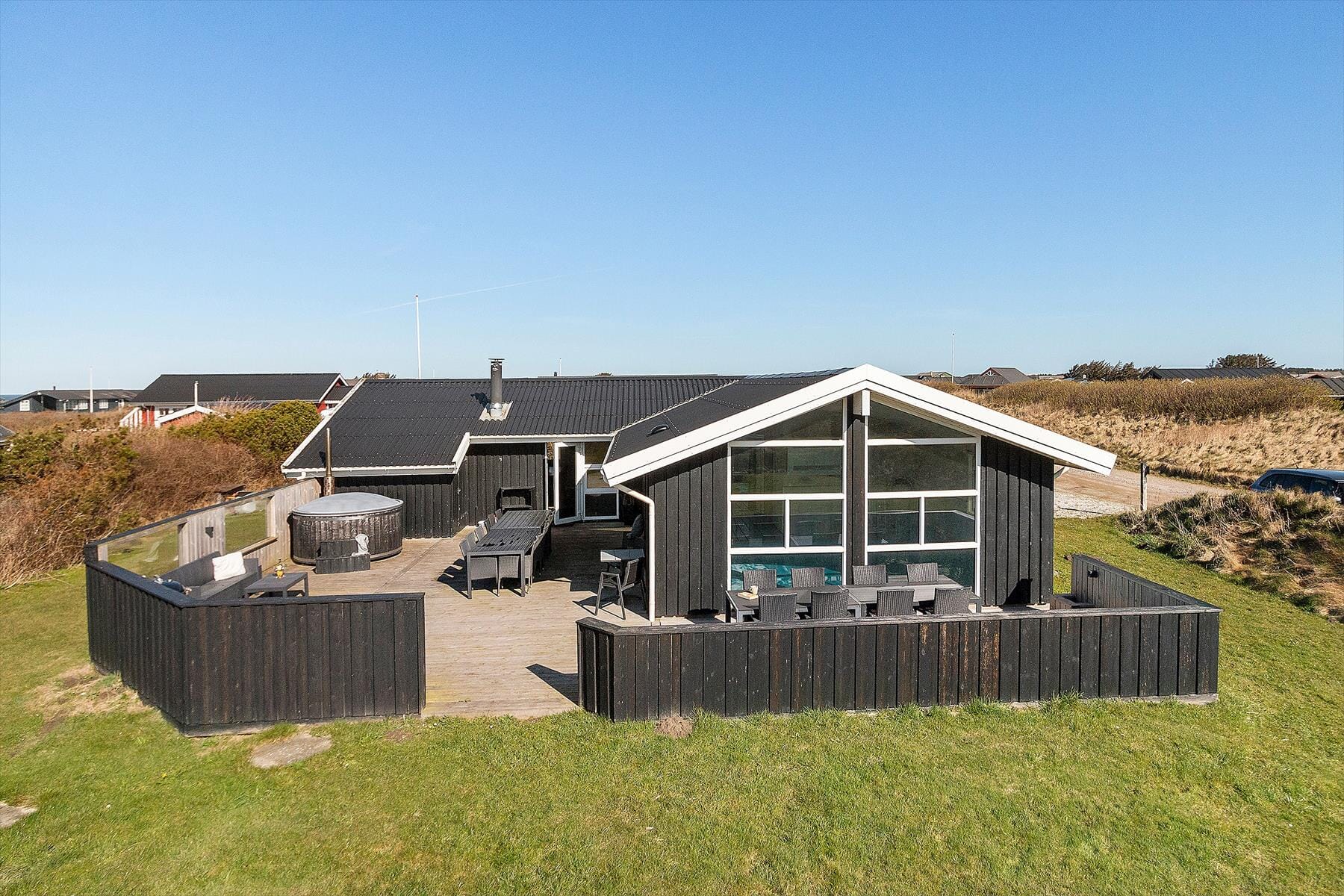 Udendørs er der masser af plads til både leg og afslapning. Den store terrasse er perfekt til både solbadning om dagen og hyggelige aftener med grill og stearinlys. Grunden omkring sommerhuset er stor og rummelig, og her kan børnene lege frit og spille bold, mens de voksne nyder den fredelige atmosfære, eller i kan tage et spil bordfodbold i udhuset. Med kun få minutters gang til Vesterhavet er det nemt at komme ned til stranden og mærke den friske havluft og høre bølgernes brusen. Om aftenen kan I samle jer på terrassen og nyde en god middag, mens solen går ned over horisonten.