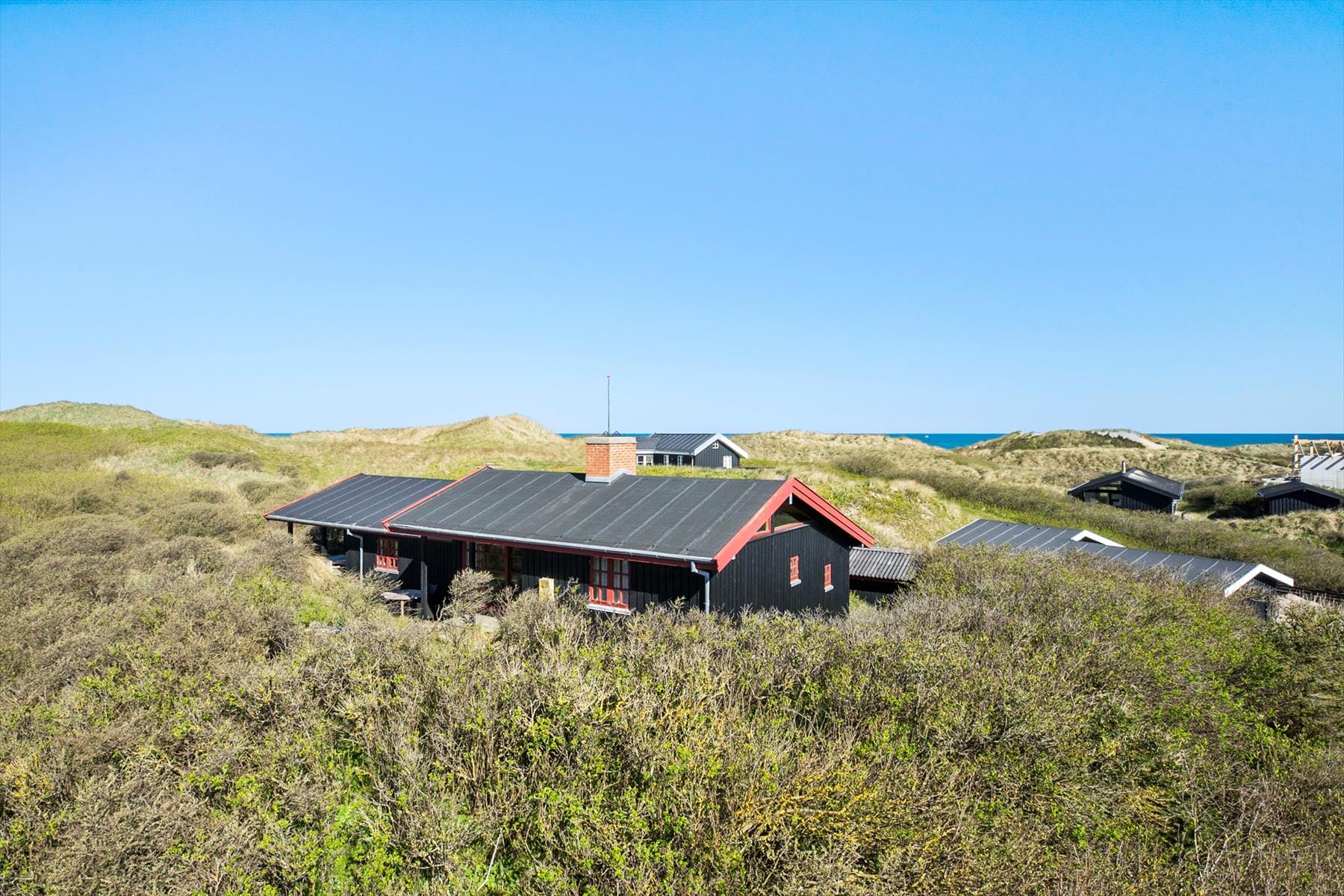 Sommerhuset har ligget her i første klitrække lige siden 1971, og selvom det er blevet løbende vedligeholdt og renoveret, har det heldigvis fået lov til at beholde sin klassiske charme. De rustikke trælister på vægge og loft bidrager til den varme og rare atmosfære i rummene, der tilsammen breder sig over 120 m2. Stuen er et skønt opholdsrum med brændeovn, fladskærms-tv og åben forbindelse til køkkenet. Fine, påmalede dekorationer pryder nogle af de profilerede døre, der leder ind til husets tre soveværelser og to badeværelser. Det ene soveværelse er indrettet med køjeseng, der egner sig bedst til børn, og alternativt er der mulighed for at overnatte på hemsen. Det største soveværelse har til gengæld egen pejs, og så ligger det lige ud til et ekstra opholdsrum, hvor I kan spille bob eller slappe af i sofaen med en god bog.