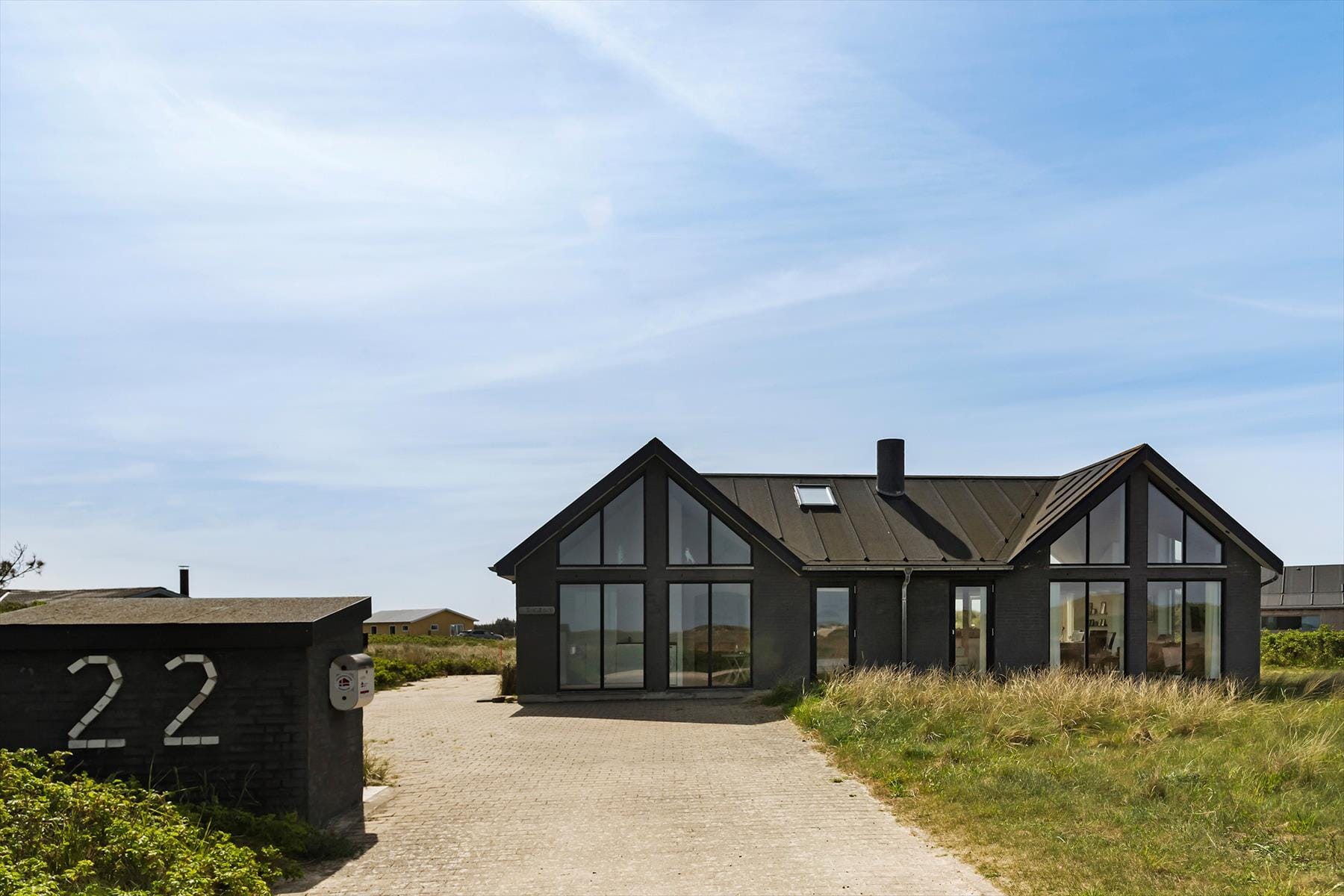 Beliggenheden i første klitrække er helt klart værd at nævne som noget af det første – men også sommerhusets lyse atmosfære og den rummelige planløsning bør fremhæves. Inden døre er der nemlig en flot loftshøjde og store vinduespartier, der inviterer solen og klitomgivelserne indenfor, og med hele 127 m2 har I masser af plads til at folde ferielivet ud. Tre soveværelser, et badeværelse og et bryggers ligger samlet i en velproportioneret afdeling, mens et fjerde soveværelse og et gæstetoilet ligger separat i et anneks med egen indgang. Sommerhusets veludstyrede køkken er integreret med en stor og stilfuld pejsestue, og herfra går der en trappe op til en stor hems, der oplagt kan bruges til en rolig læsestund, en siesta, børnenes leg eller eventuelt overnatning.