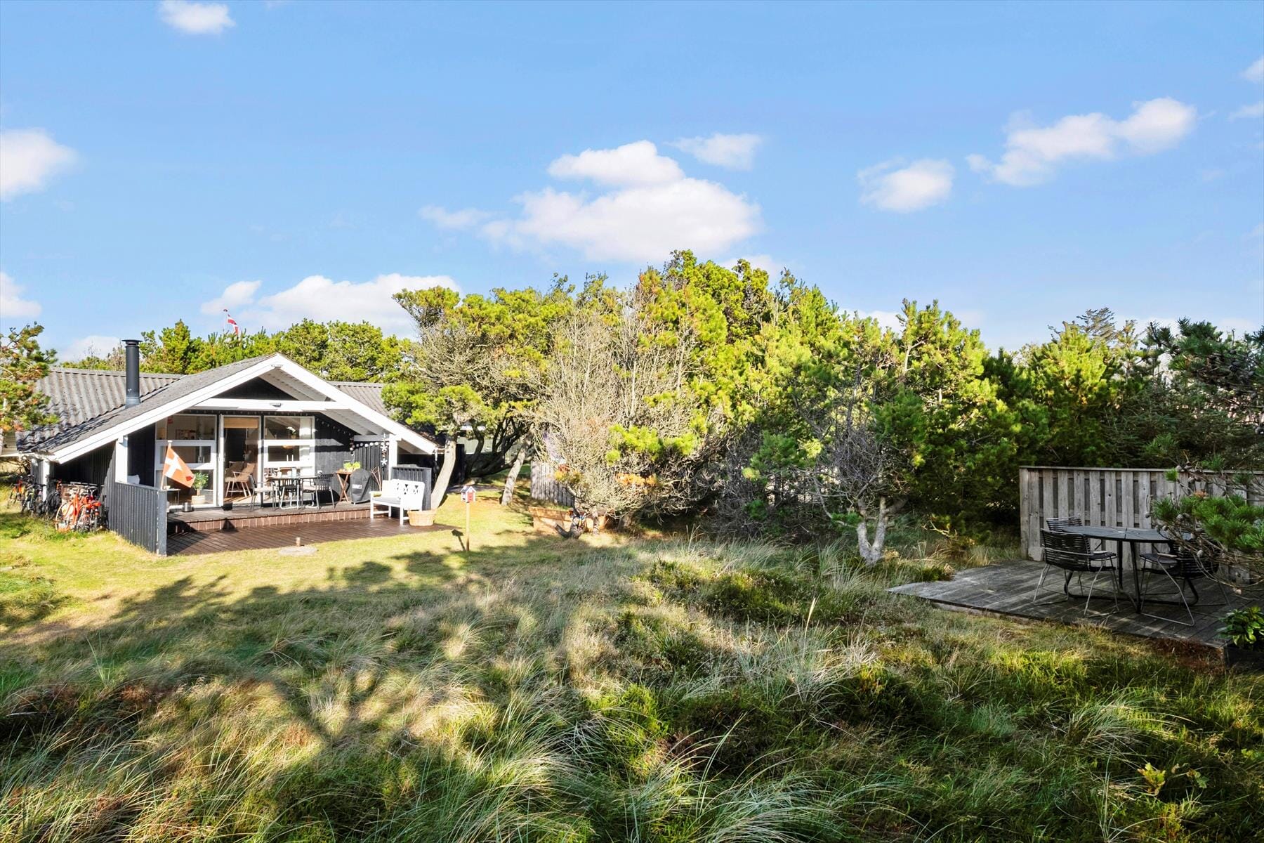Udenfor kan du virkelig nyde den afslappede ferieatmosfære. Den overdækkede terrasse giver mulighed for at tilbringe tid udenfor, uanset vejret. Det er det perfekte sted at nyde morgenkaffen eller slappe af med en god bog, mens du lytter til lyden af fuglene i haven. Den store naturgrund omkring huset giver rig mulighed for både leg og afslapning, og med den korte afstand til stranden kan du hurtigt finde vej til den brede sandstrand for en forfriskende dukkert. Terrassen er også ideel til at tilberede middag på grillen, mens solen langsomt går ned, og den rolige stemning breder sig omkring dig.
