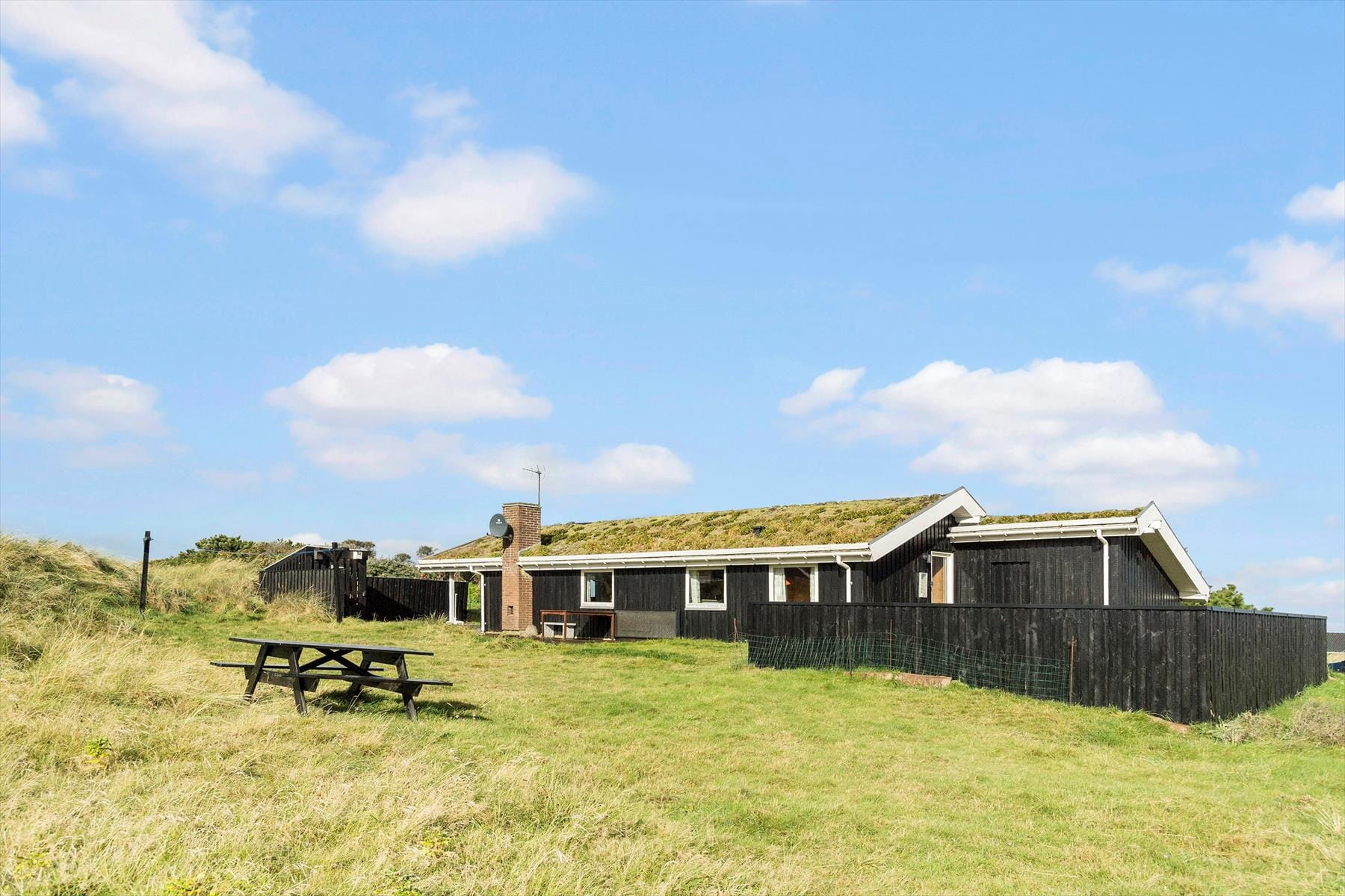 En del af 1840 m2 store grund er enkelt holdt med græsplæne, og resten smelter nærmest sammen med det omgivende klitlandskab. Nær sommerhuset er der flere terrasser at vælge imellem: Én er delvist overdækket og med havudsigt, mens andre er helt åbne, så i løbet af ferien kan I flytte jer rundt alt efter vind og vejr.