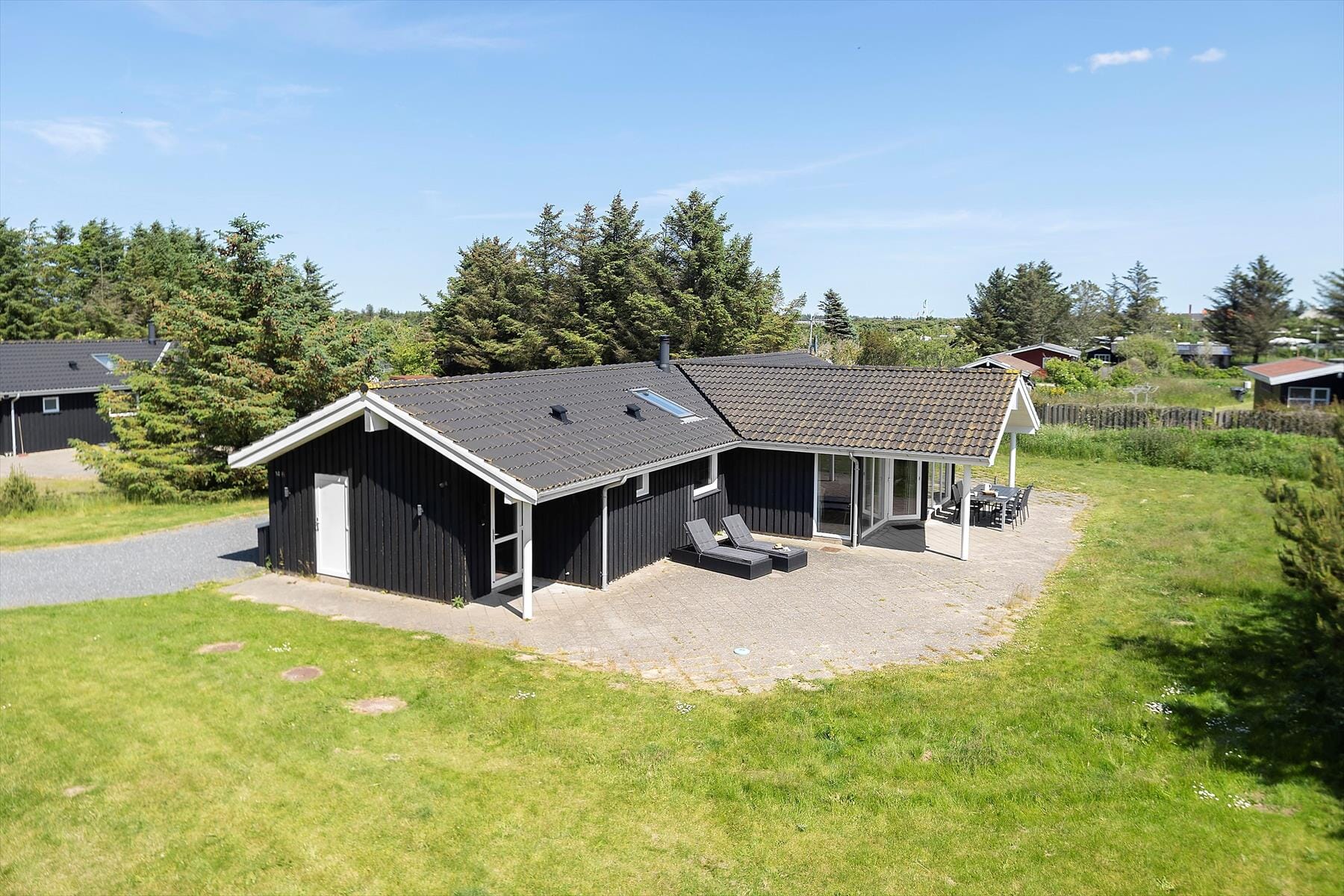 Fra stuen har man adgang til sommerhusets store og flotte terrasseareal, som løber på flere sider. Mod syd er terrassen delvist overdækket, her er især skønt om aftenen, når duggen falder, og man stadig gerne vil have en time eller to mere ud af dagen. Grunden har masser af plads til leg og boldspil, og der er selvfølgelig havemøbler og grill til rådighed.