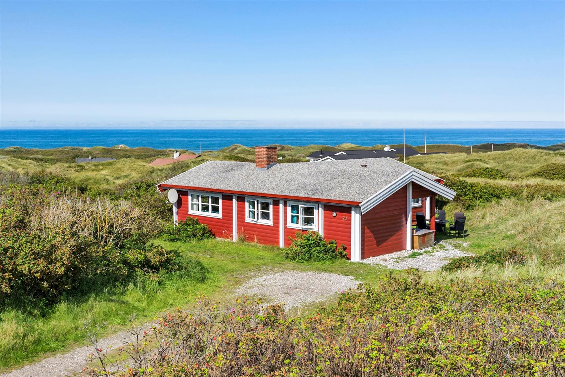 Med en flot udsigt over det kuperede klitlandskab og Vesterhavet, ligger denne velholdte og hyggeligt møblerede bjælkehytte. Køkkenet er rummeligt og ligger i åben forbindelse med spisestuen, hvor familien kan samles om måltiderne. I forlængelse heraf, kommer den hyggelige opholdsstue med behagelige møbler og holder man ferie i de koldere måneder, kan man tænde op i brændeovnen og lade varmen sprede sig og slappe af med en god bog, et spil eller en sjov film som hele familien kan samles om. I husets 90 m2 er der desuden et rummeligt badeværelse med vaskemaskine og sauna og tre værelser med dobbeltsenge. Sommerhuset er godt udstyret med hårde hvidevarer og andre moderne faciliteter som parabol og trådløst internet – et godt valg med god stemning og en varm atmosfære.