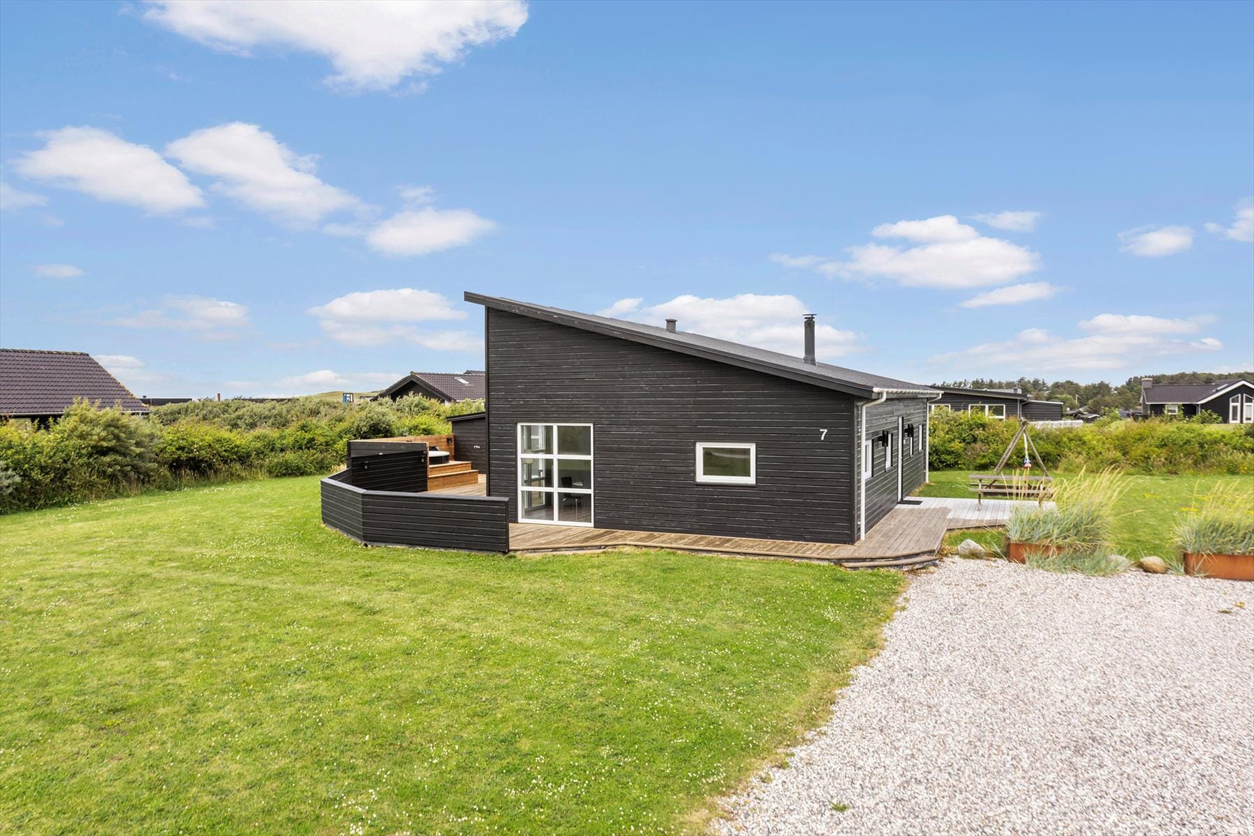Sommerhusets udendørsarealer er lige så indbydende som indendørs. Her kan du tage et velfortjent pusterum i vildmarksbadet, der står klar til at byde dig på varme stunder under åben himmel. Den store have giver god plads til både leg og afslapning, og udhuset med bordfodbold gør det muligt at hygge sig. Terrasserne omkring huset indbyder til morgenkaffe i solen, grillmiddage med familien eller en stille stund i skyggen med en god bog. Huset er også tæt på stranden, hvor du kan tage en frisk dukkert i havet eller gå lange ture langs kysten.