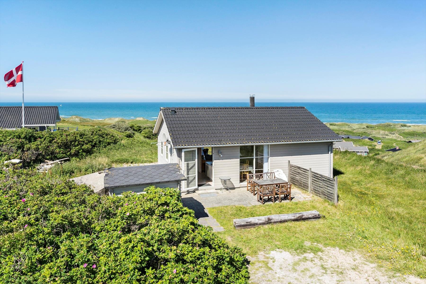 Omkring sommerhuset er etableret 3 hyggelige terrasser, som sikrer at man altid kan finde læ for vinden, og der er fra to af disse muligheder for igen at nyde udsigten. Som en lille bonus er der på grunden under byggeriet af dette hus kommet en bunker til syne, så man kan opleve lidt historisk vingesus helt tæt på.