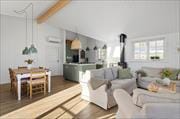 Sommerhuset er lyst og venligt indrettet med ludbehandlede trægulve og ovenlysvinduer. I stuen, som ligger i åben forbindelse med det flotte og lyse køkken, findes der bordfodbold, og de store vinduespartier fra loft til gulv og ovenlysvinduet giver også her et flot lysindfald og gør hele rummet lyst og rummeligt. Fra stuen er der adgang til en flot træterrasse, som er delvist overdækket. I sommerhuset er tre soveværelser og et flot badeværelse med spabadekar, gulvvarme og vaskemaskine og tørretumbler. Kort sagt findes her alt, hvad der er nødvendigt for et godt og vellykket ophold i det nordjyske.