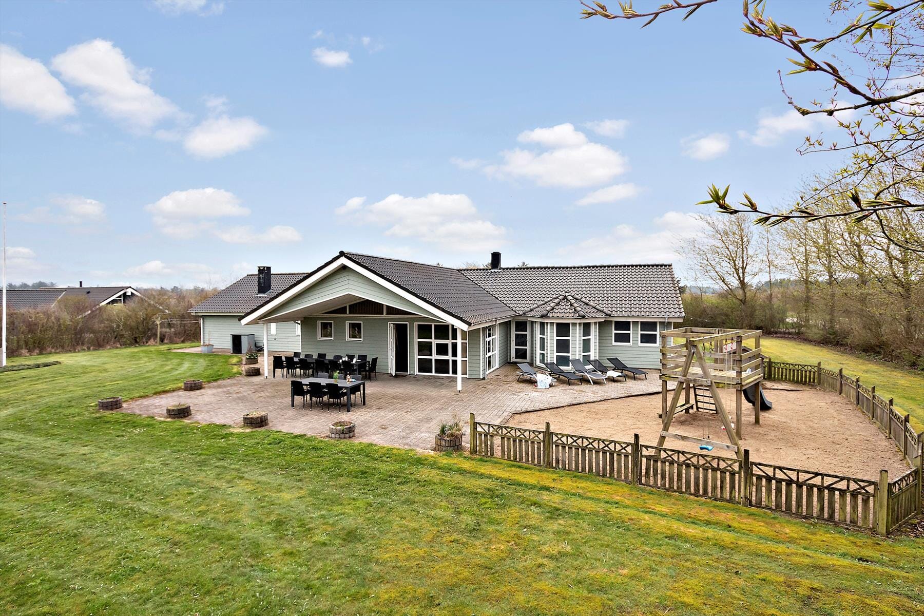 Huset er beliggende på en 2800m2 stor plænegrund omkranset af træer og buske, hvilket gør at man føler sig ugeneret af de omkringliggende huse. Der er masser af plads til leg og boldspil på græsarealerne og legepladsen med sandkasse, gynger og legehus er et hit for familiens yngste. Terrassen løber om en stor del af huset, og er solen for voldsomt en dag, kan man sætte sig ind under den overdækkede del; her er også skønt om aftenen med et glas vin eller en varm kop kaffe. På parkeringspladsen foran huset, er der mulighed, for at parkere med flere biler.