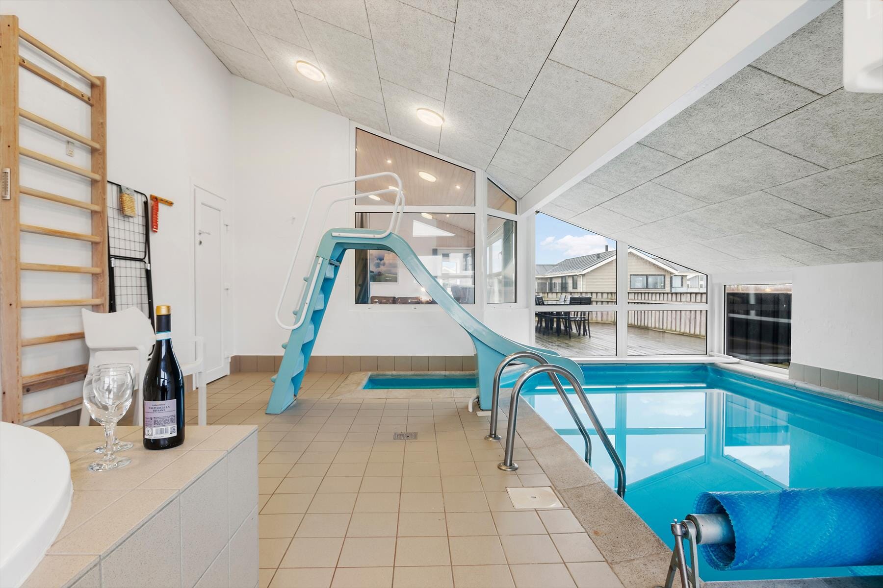 Sommerhusets hjerte er den store, lyse opholdsstue med et glasparti, der giver udsyn til poolrummet. Her kan du sidde og nyde en bog eller slappe af med et glas vin, mens du ser de andre more sig i poolen. Brændeovnen tilføjer en ekstra hyggelig atmosfære og er perfekt til de køligere aftener. Indretningen er moderne og stilren, og den åbne forbindelse mellem køkken og stue skaber en dejlig rummelighed, der indbyder til socialt samvær. I køkkenet kan du lade dig inspirere af lokale råvarer og tilberede lækre feriemåltider, mens samtalerne flyder frit mellem kokken og gæsterne.