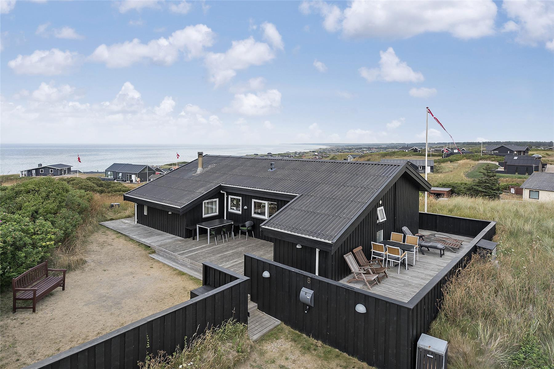 Sommerhuset har terrasse hele vejen rundt, og en del er overdækket samt med læhegn, så det er nemt at finde solskin og læ. Sommerhuset ligger højt hævet, og fra flere sider er der en skøn udsigt. Grill og havemøbler gør det oplagt at nyde flere af feriens måltider udendørs – hvem vil ikke gerne nyde et lækkert måltid med familien og udsigt over Vesterhavet?