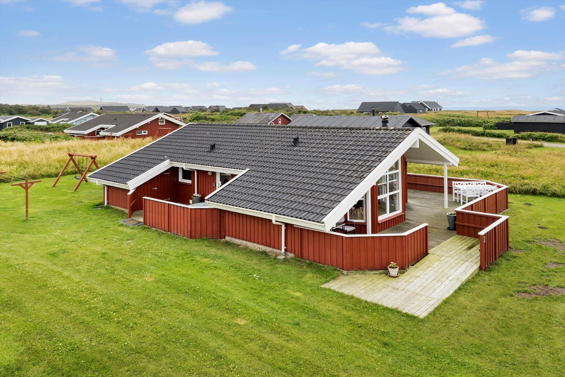 Med en stor terrasse og et skønt haveareal bliver livet udenfor en naturlig del af ferien på Fjorden 2. Her kan du starte dagen med en stille kop kaffe i morgensolen og runde den af med et glas vin i den lune sommeraften – alt sammen med et betagende kig til havet i horisonten. Gyngestativet i haven er et hit blandt de yngste gæster, og der er god plads til boldspil, fangelege og picnic i det fri. Terrassen er udstyret med komfortable havemøbler, og uanset om du er til grillmiddage, solbadning eller eftermiddagslæsning i skyggen, kan du finde dit favoritspot her. Fuglesang og duften af klitternes marehalm sætter stemningen, og du skal ikke bevæge dig mange meter, før du står med fødderne i det varme sand ved stranden. Når solen skinner, og Vesterhavet kalder, er det nemt at pakke strandtasken og tilbringe timevis ved kysten – med bare tæer, vind i håret og salt på læberne.