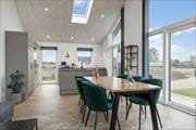 Sommerhuset er et elegant byggeri med træfacade og store vinduesparti, og det er blevet opført i 2023. Ikke bare udefra, men også inden døre er huset en fryd for øjnene. Der er nemlig kønt sildebensparket på gulvet, loft til kip og lækkert møblement, som sørger for, at I får det særdeles behageligt. En rummelig entré giver jer adgang til opholdsafdelingen, hvor stue og køkken ligger i åben forbindelse. I køkkenet har I gode arbejdsforhold, når der skal kokkereres, og hvis I vil se film eller serier, er der et stort fladskærms-tv med Chromecast nær sofaarrangementet. Sommerhusets to dejlige soveværelser og en hyggelig hems byder på sengepladser til i alt seks personer, og endelig er der to badeværelser, hvoraf det ene er med vaskesøjle og det andet med sauna.