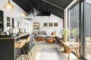 Sommerhuset og det tilhørende anneks har et stilfuldt ydre med en sort træfacade, der brydes af store vinduespartier og naturfarvede lamelvægge. Inden døre giver de hvidmalede vægge en flot kontrast til de sorte akustiklofter, der går helt til kip, mens sildebensparket danner et elegant underlag i opholdsafdelingen og på soveværelserne. Tre soveværelser med dobbeltseng og to brusebadeværelser hører med til planløsningen i selve hovedhuset, mens annekset har to soveværelser, eget badeværelse og et lille opholdsrum med ekstra sovesofa. Alle rum fremstår yderst velindrettede og har en skøn atmosfære – men mon ikke, I mest af alt har lyst til at opholde jer i hovedhusets opholdsafdeling, når I vil slappe af og hygge jer sammen? Her bliver I forkælet med et veludstyret og lækkert køkken, et flot spisebord nær brændeovnen, en god hems og et skønt flyderhjørne med en stor hjørnesofa.