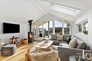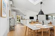 Indenfor mødes du af en hyggelig og indbydende atmosfære, hvor den varme brændeovn står klar til at sprede varme på kølige aftener. Her kan I samles omkring stuen og nyde hyggelige stunder med familie eller venner, mens flammerne kaster sit bløde lys. Indretningen er klassisk sommerhusagtig med hyggelige detaljer, der giver en afslappet stemning, perfekt til ferie. Loft til kip og lyse vægge bidrager til et luftigt indtryk, og selvom huset er enkelt, er det fuldt ud funktionelt og komfortabelt. Det er nemt at forestille sig, hvordan morgenkaffen nydes her inden dagens strandtur, eller hvordan aftenen afsluttes med en god bog og bløde lamper, mens hunden ligger tæt ved fødderne.