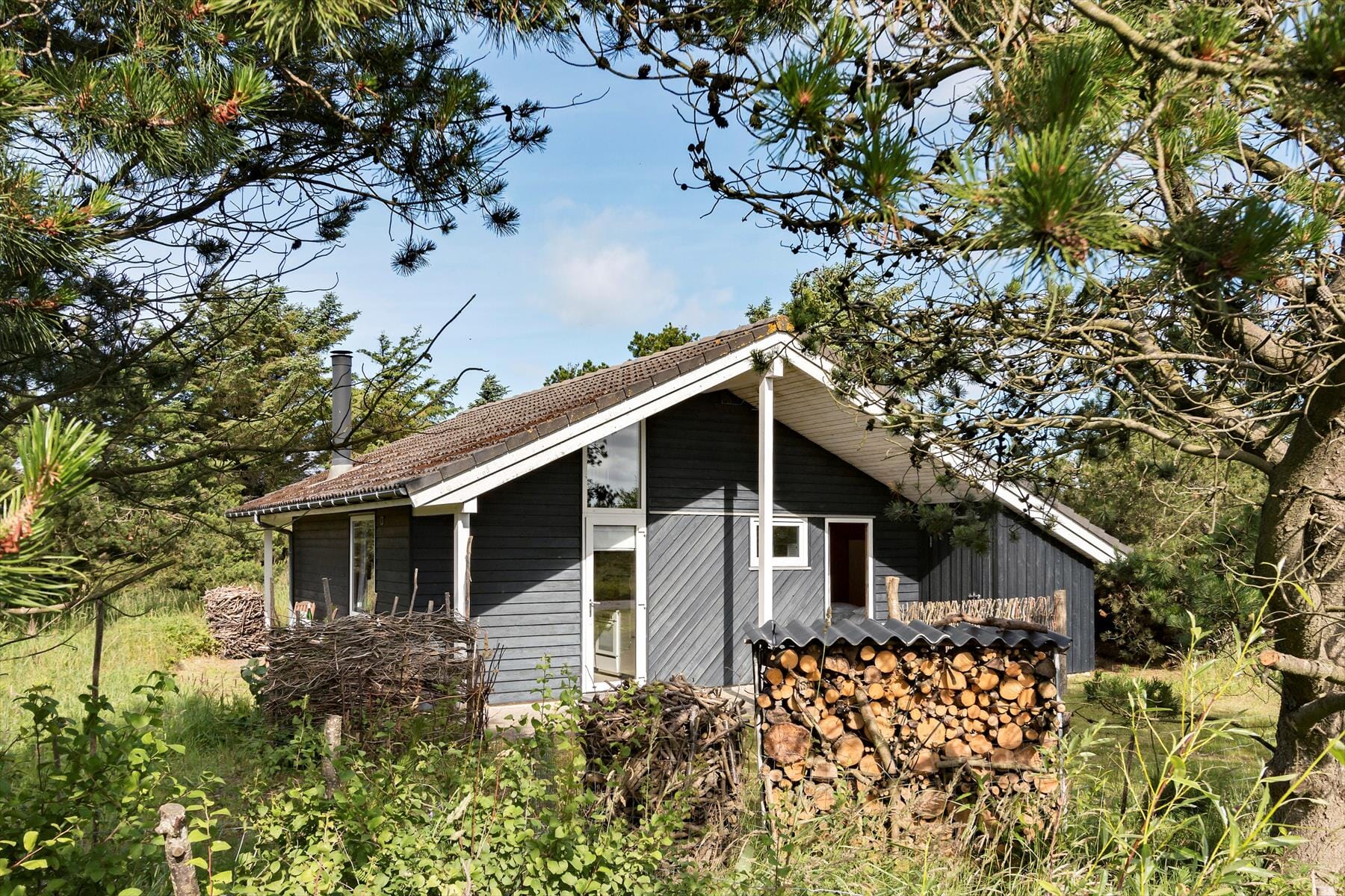 Sommerhuset ligger godt skærmet af fyrretræer, hybenbuske og anden bevoksning på naturgrunden, og de ugenerede omgivelser får I selvfølgelig stor glæde af ude i det fri, hvor der er flere lækroge og solrige opholdspladser at vælge imellem. En del af den vestvendte terrasse er overdækket, og i bedste feriestil har I havemøbler, liggestole og en parasol til rådighed.