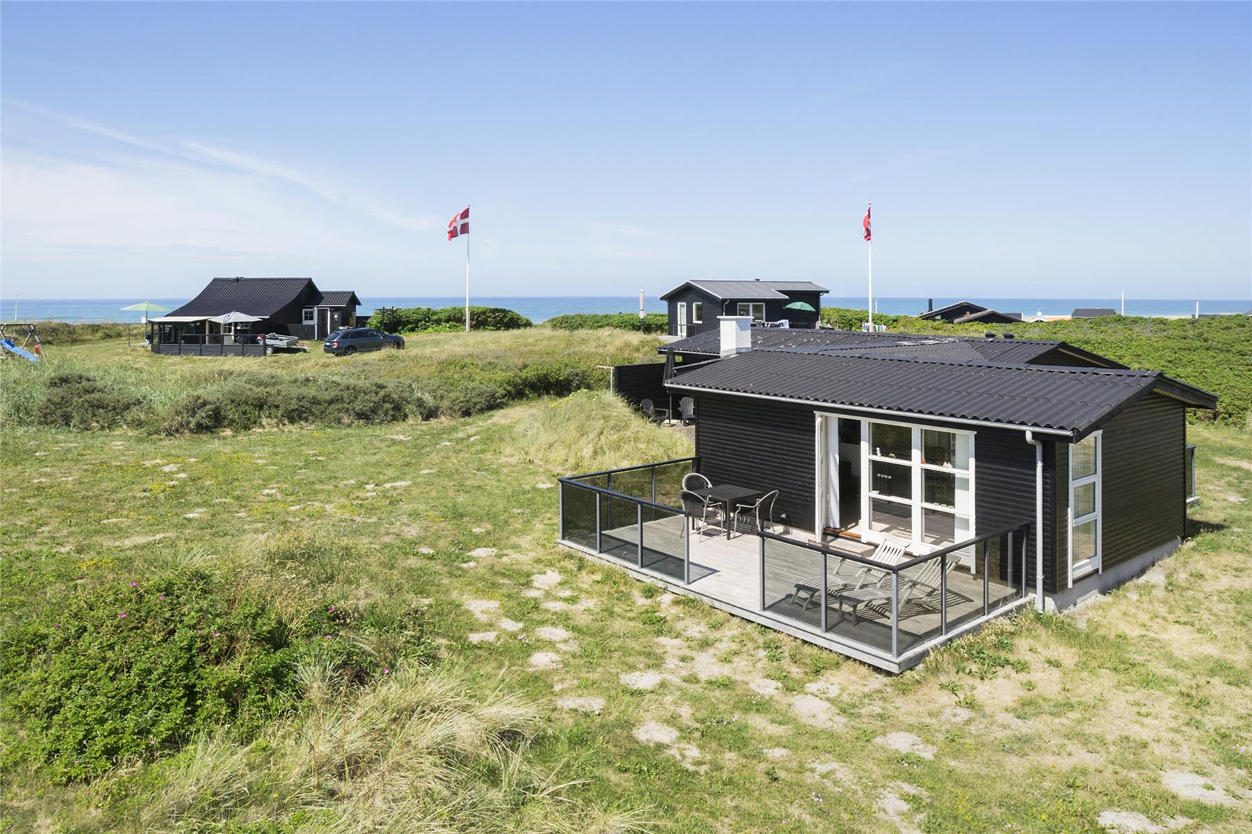 Huset ligger på en stor naturgrund med marehalm, græsplæne og hybenbuske, fra flere steder kan I se Vesterhavet, som ligger meget tæt på. Rundt om huset er tre åbne terrasser, så der er god chance for at få udbytte af alle sommerens soltimer.