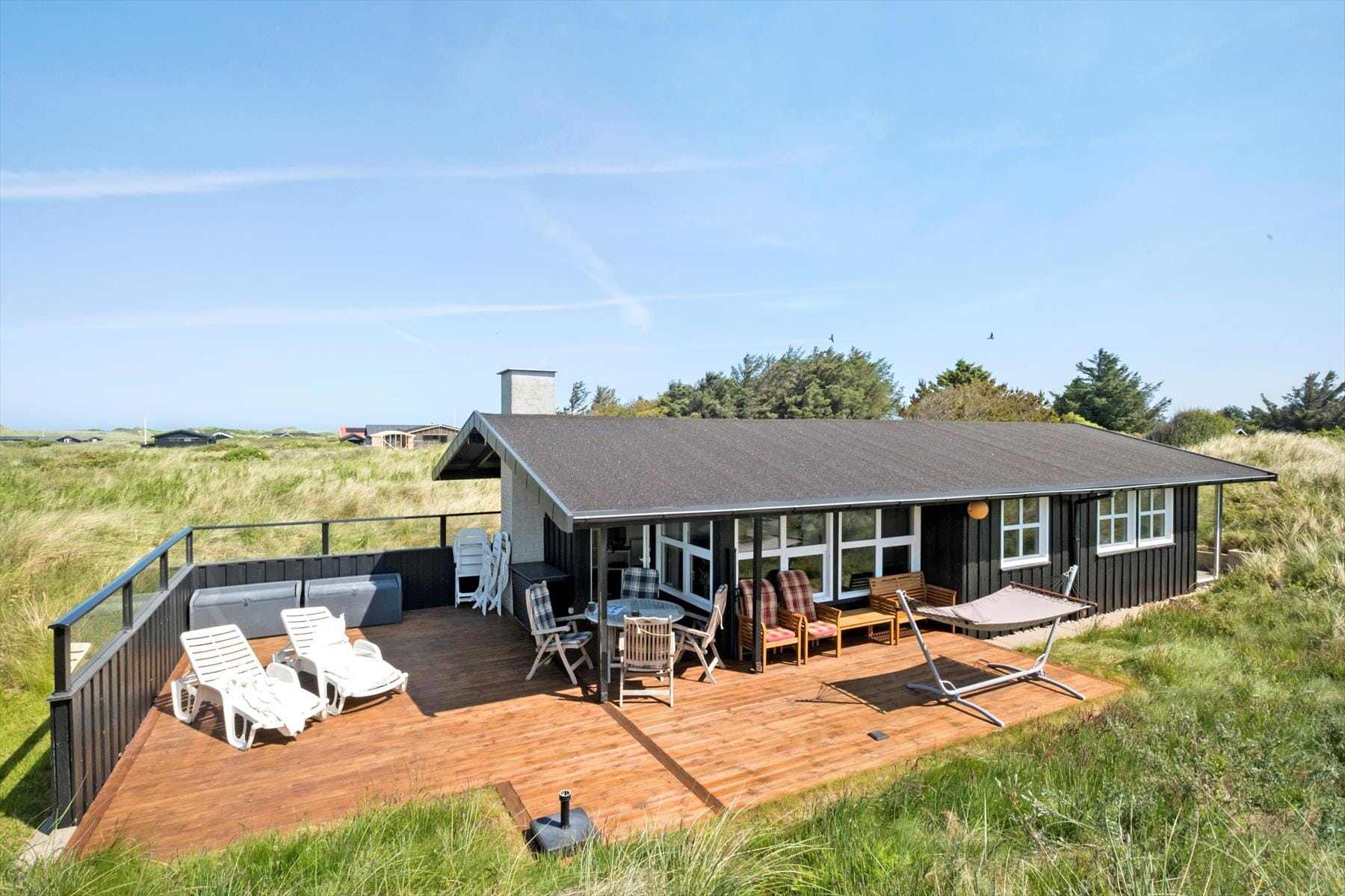 Der er fine terrasser på flere af husets sider, så der er god mulighed for at finde både sol og læ. Der er direkte udgang fra køkken-alrummet til terrassen, og der hører også en grill til huset, så det er nemt at forestille sig, at man kunne nyde flere af feriens måltider udendørs.