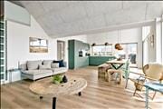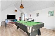 Huset er opført i en enkel, tidløs byggestil med sortmalet træfacade og store vinduer. Her mærker man med det samme den gode kvalitet i alle løsninger, og indenfor er der en utroligt indbydende atmosfære, som med det samme bringer feriefølelsen frem. Rummene er lyse og lækre, og de store vinduespartier og kiplofterne trækker Vesterhavets enestående natur helt ind i huset. Huset har et stort opholdsrum med integreret køkken og udgang til terrasser mod vest og syd. I tillæg til de tre soveværelser er der en hems i stuen med fire enkeltsenge samt en hems på et af dobbeltværelserne med to enkeltsenge. Der er et fint aktivitetsrum i annekset med bordtennis, billard, dart og bordfodbold – og som ekstra bonus er der et lille minikøleskab, så man kan nyde en kold sodavand, mens man dyster. Endelig er der to badeværelser, hvoraf det største er udstyret med badekar, vaskemaskine og tørretumbler.