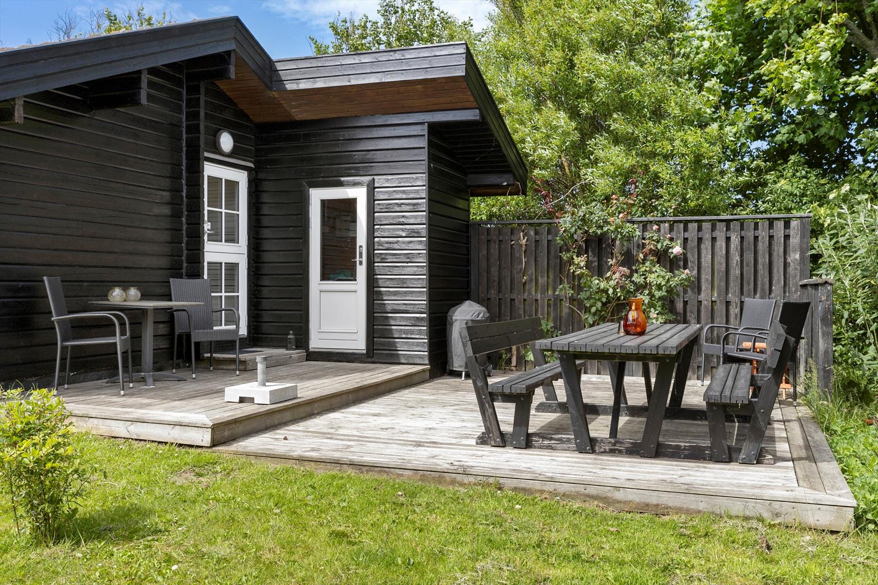 Som­mer­hu­set ligger på en plan na­tur­grund med træer og buske til at give læ for Ve­sten­vin­den og med en dejlig, delvist overdækket terrasse, hvor du kan nyde sommeren med sol­bad­ning, lækre grillmåltider og de lange lune aftener. På østsiden af huset findes en skøn terrasse med dejlig udsigt over na­tur­grun­den.