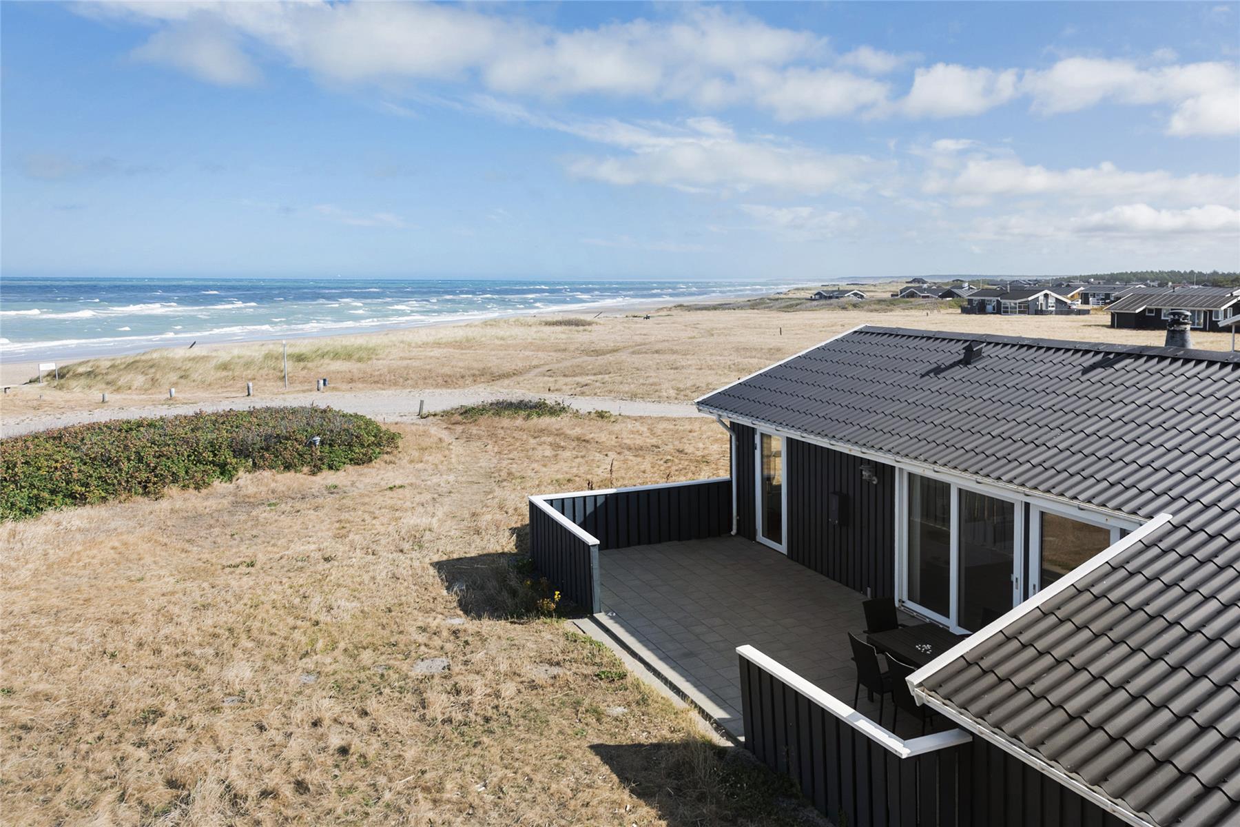Huset ligger blot et stenkast fra stranden og Vesterhavet - der er ca. 50 meter fra sommerhuset og til stranden. Der er flot udsigt ud over horisonten både fra den vestvendte terrasse og direkte fra huset. Specielt er det unikt at kunne sidde rundt om spisebordet og nyde så storslået en udsigt. Flere dejlige terrasser omgiver huset og en er helt aflukket, hvilket er en stor fordel for dig, som medbringer mindre børn eller din hund på ferien.
