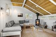 Inden døre bliver du budt velkommen af en hyggelig og hjemlig sommerhusstemning. Her er der loft til kip, træbeklædte vægge og et indbydende opholdsrum, hvor stue og køkken ligger i åben forbindelse. Brændeovnen skaber en dejlig varme på de køligere dage, og de store vinduer lukker masser af naturligt lys ind, så du får en fornemmelse af at have naturen helt tæt på. De bløde sofaer indbyder til afslapning, mens spisebordet samler familien til hyggelige måltider og lange samtaler. Sommerhuset har flere gode soveværelser, så alle kan finde sig godt til rette efter en dag med feriesysler.
