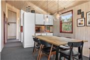 Feriehuset er rigtig praktisk indrettet med åbent køkken til både spisestue og opholdsstue. Herfra er der udgang til en dejlig delvist overdækket terrasse med den mest fantastiske havudsigt. Huset er indrettet med funktionelle møbler og en lille brændeovn, som kan gøre nytte, hvis aftenerne skulle blive lidt kolde. Der er tre soverum med hhv. dobbeltseng, to enkeltsenge og et værelse med en køjeseng og en enkeltseng, som ikke har fuld længde. Badeværelset er lyst og praktisk indrettet med bruseniche.
