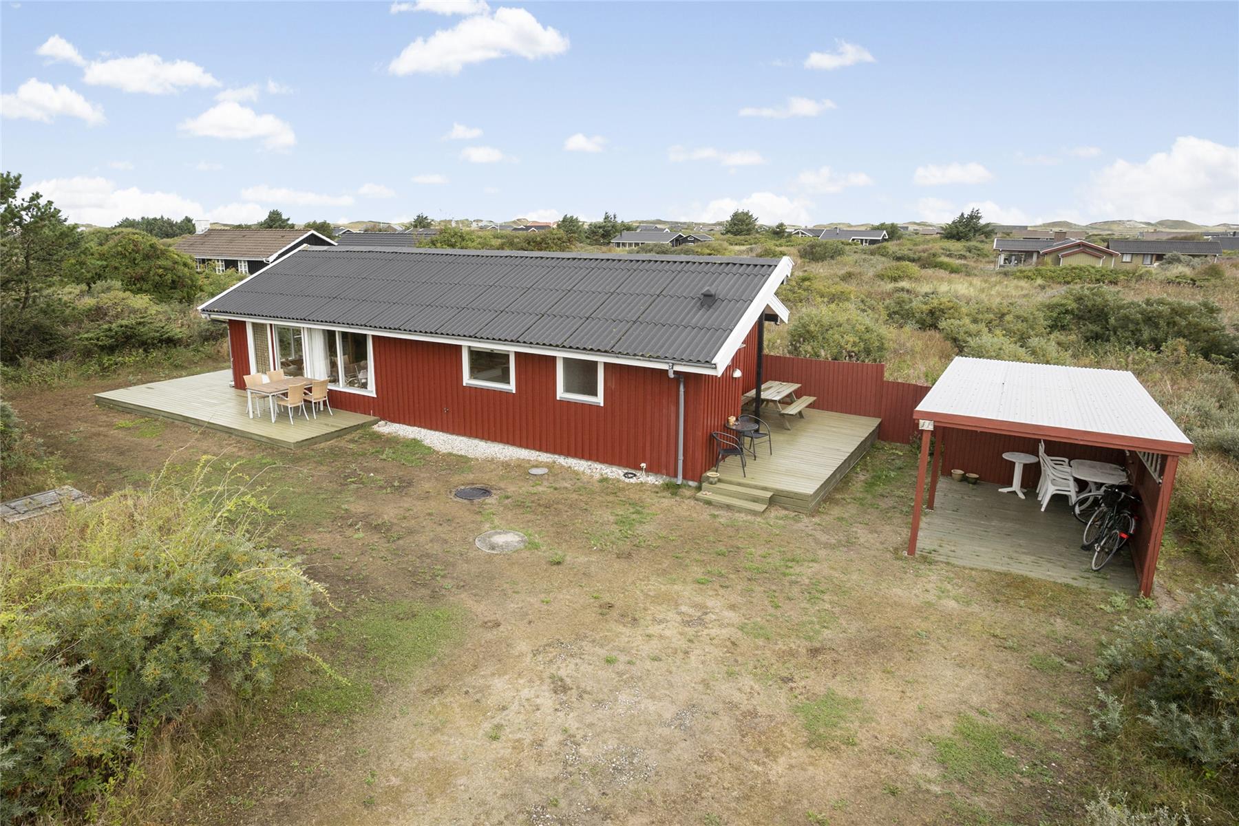 Grunden er en stor klitgrund med god plads til boldspil og leg. Der er to gode terrasser, som gør det muligt at spise alle måltider udenfor. Der er lidt havudsigt fra grunden.