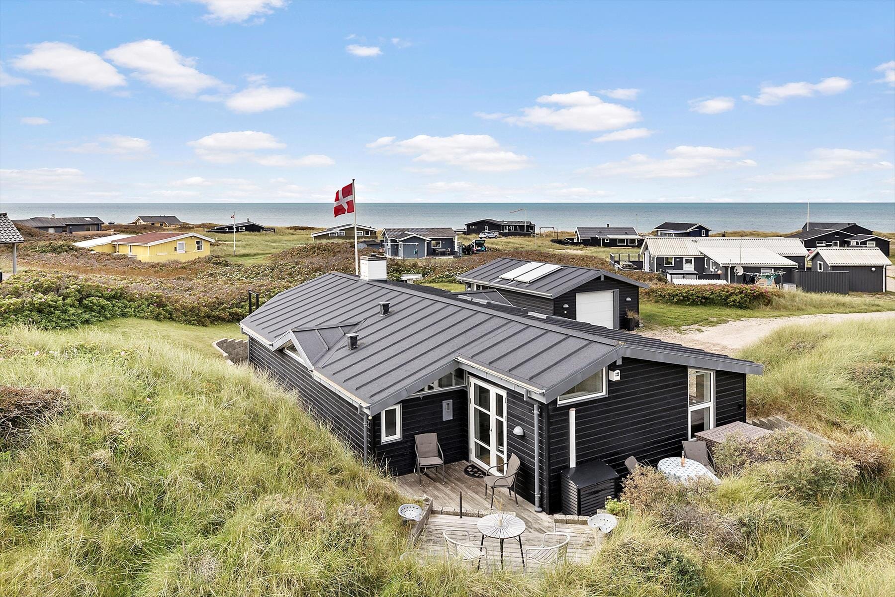 Sommerhuset er udstyret med flere terrassedøre, så det er nemt at komme ud i det fri, når solen skinner. Rundt om huset er der flere terrasser at vælge imellem – blandt andet en niveaudelt terrasse mod sydøst, der nærmest ligger som en lille gryde i klitterne.