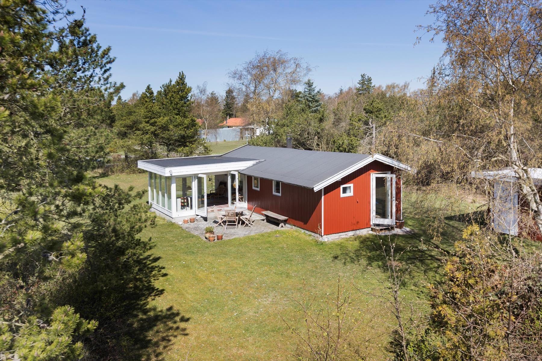 Sommerhuset er omkranset af en dejlig stor have og har en skøn terrasse ud for havestuen med gode havemøbler. Derudover er der en hyggelig overdækket terrasse mellem carporten og skuret, hvor du kan sidde når duggen falder og nyde stjernerne med et glas vin. Bagved husets grund, er et stort fællesareal hvor der kan spilles fodbold, rundbold og eller lave andre udendørs aktiviteter, der kræver lidt mere plads. Her finder I både plads til hygge, afslapning og natureventyr. Fra huset har I kun 200 meter til den gode Ulvshale Strand.