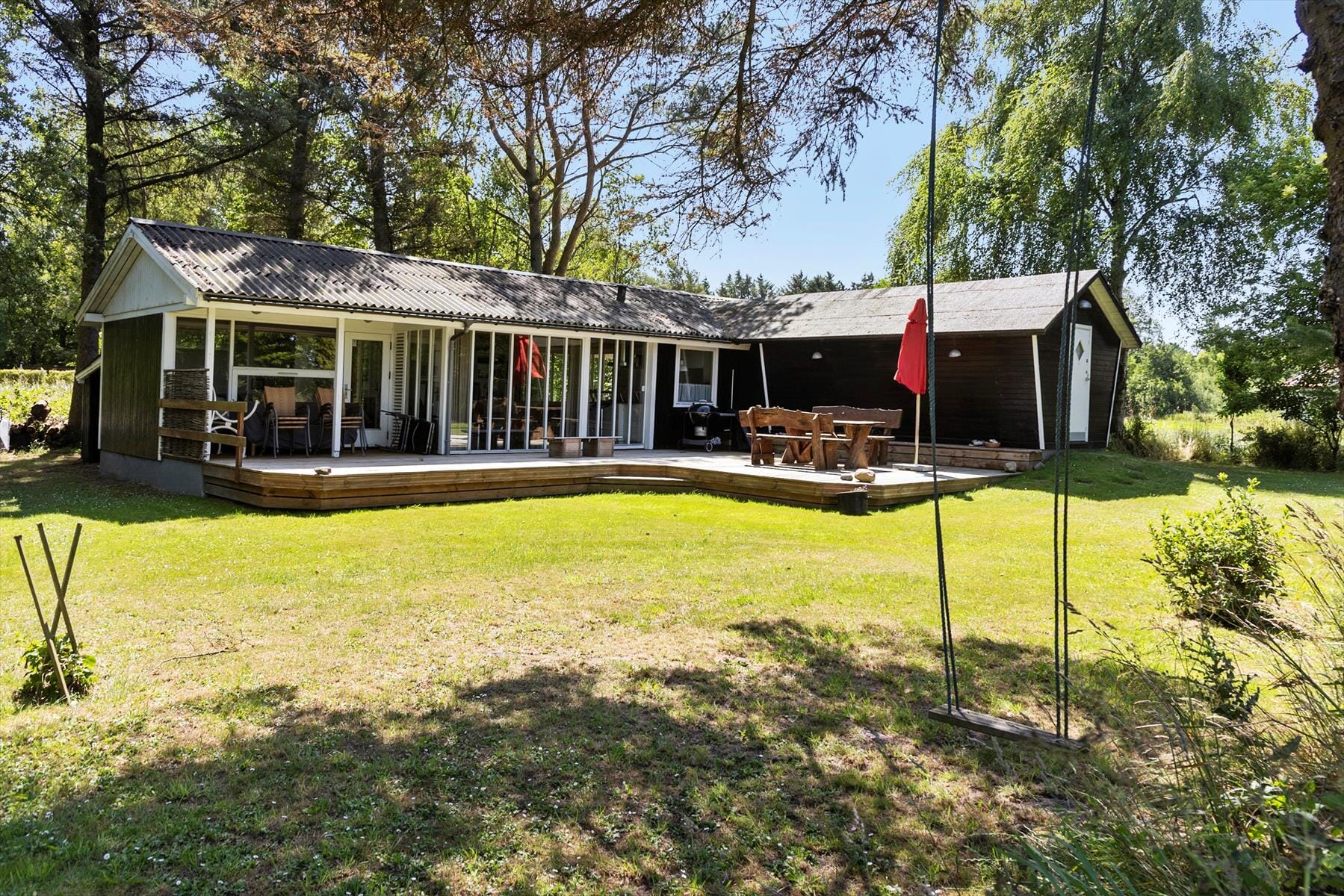 Udelivet kan nydes i fulde drag på den flotte terrasse, hvor I både kan fange solens stråler, dække op til morgenmad i det fri eller grille aftensmaden, mens duggen falder blidt over haven. Udsigten over det omkringliggende landskab skaber en følelse af ro og frihed – og det særlige shelter, som hører til huset, gør det muligt at tilbringe en nat under åben himmel, hvis I har lyst til en ferieoplevelse lidt ud over det sædvanlige. Haven er grøn og indbydende, og både børn og voksne vil hurtigt finde sig til rette her med leg, ro og måske en eftermiddagslur i solen.