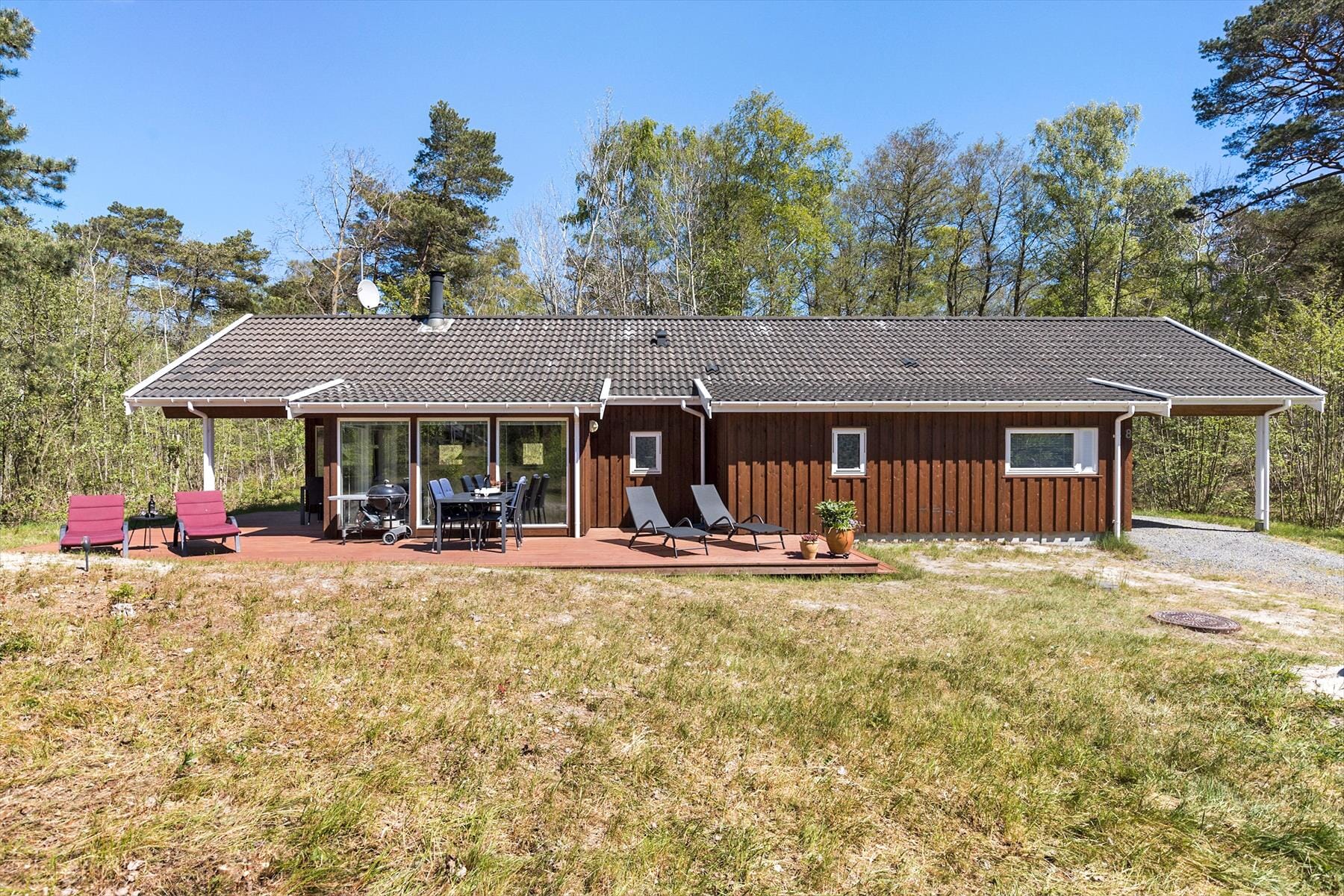 Huset ligger på en 2.500 m2 naturgrund så der er rig mulighed for et aktivt ude liv. Let skov omgiver huset men der er stadig mulighed for at nyde solen på den sydvest vendte terrasse. Noget af terrassen er overdækket. Start dagen her med et lækkert morgenbord og slut dagen her mens maden simrer på grillen og fjælstaunijn (nattergalen) lader sin smukke sang lyde ud over området og I nyder jeres yndlingsdrik. Bilen kan I parkere ved huset.