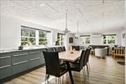 Lyst og indbydende sommerhus som er godt indrettet. Stuen er lys og åben med et hyggeligt sofahjørne med udsyn til grunden via den dobbelte terrassedør, som giver et godt lysindfald i huset. I tilknytning til stuen er det åbne og funktionelle køkken, hvor dagens måltider kan tilberedes imens du fortsat er en del af selskabet. Ved køkkenet er der et spiseområde samt brændeovn, som kan tændes på en kølig hyggeaften. Fra spiseområdet/stue er der adgang til den store terrasse. Huset er indrettet med fire soveværelser, tre med dobbeltsenge og et med to enkeltsenge. Badeværelset har toilet, bruseniche og vaskemaskine. En afslapningsferie her vil I tænke tilbage på med glæde.
